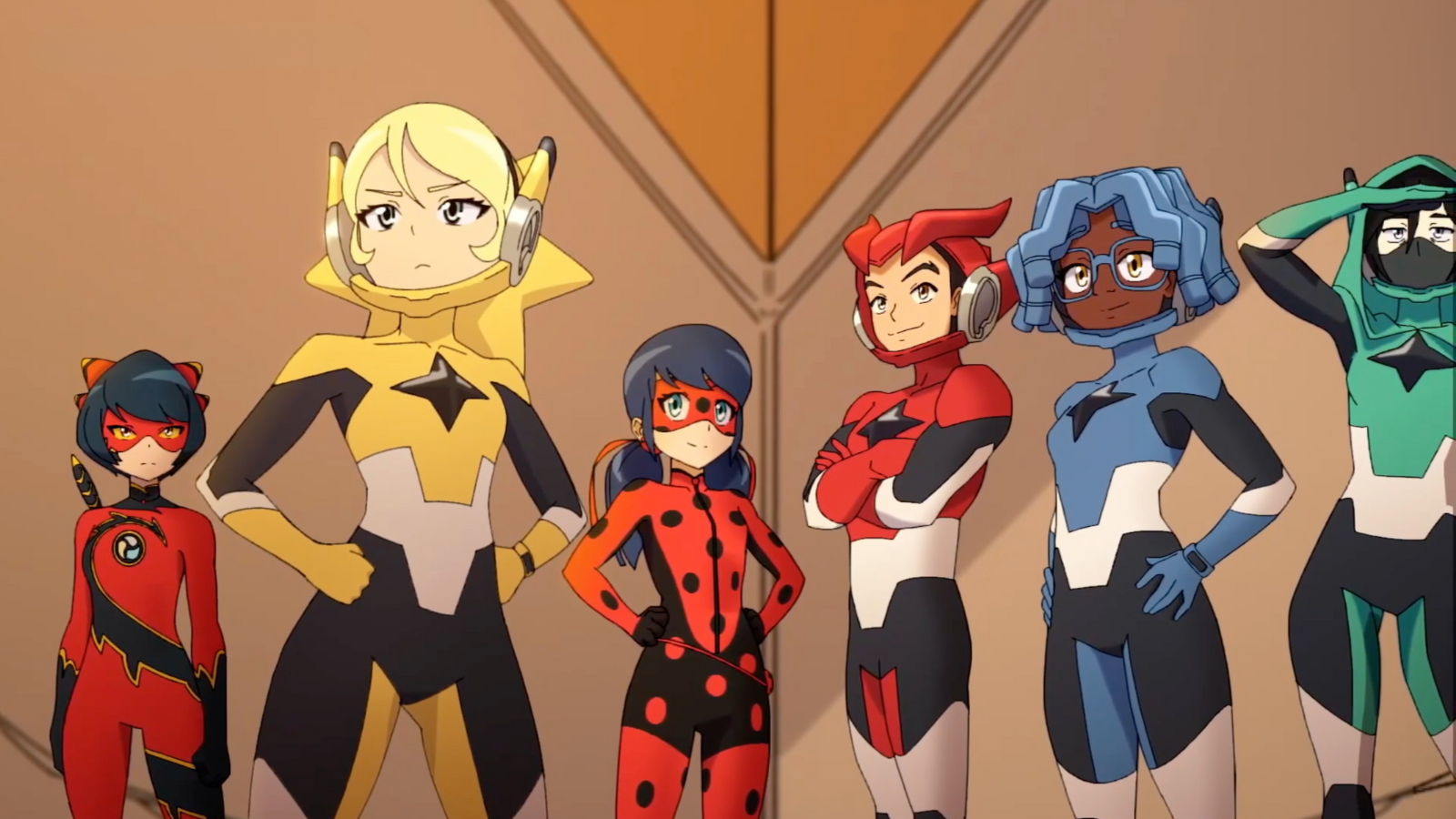 Stellar Force transforms using Stellar Matrix sprites that become wristwatches and a matrix shard, unlocking suits styled after the Japanese tokusatsu tradition. Each member sports a distinct color and helmet and commands a personal mecha. As in Power Rangers/Super Sentai, their mechas can combine into a giant robot built for battling larger-than-life foes. The upcoming Miraculous Stellar Force series fully embraces this tokusatsu influence, making it a notable stylistic departure within the Miraculous universe.