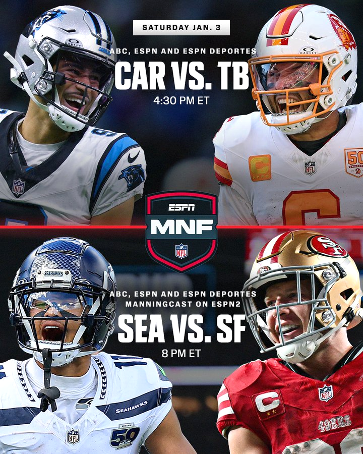 - The doubleheader starts on Saturday January 3rd, 2026 with the Carolina Panthers going head to head against the Tampa Bay Buccaneers at 4:30 PM ET, live from Raymond James Stadium in Tampa, Florida.