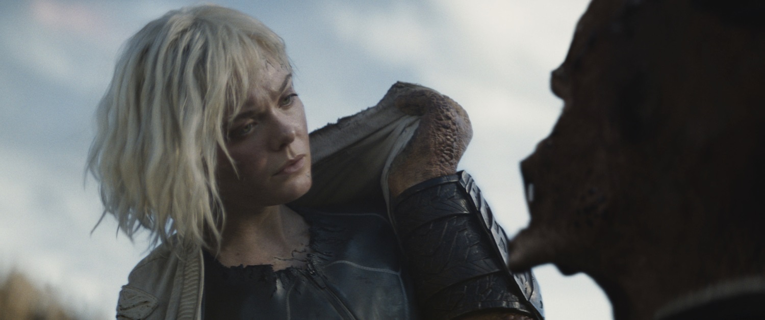 A leg-less Elle Fanning rides on the back of a young Predator in the new trailer for "Predator: Badlands"
