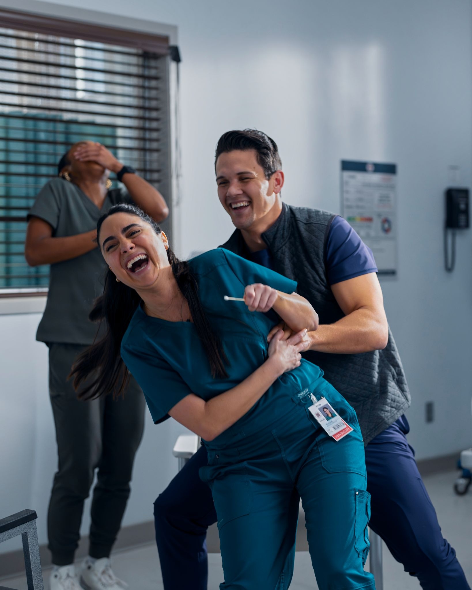 Amanda: Especially getting to know the new tone of the show. The old show was so broad, and this new tone is continuing to have that same Scrubs heart and feel, but in a more grounded way. We were thankfully shepherded and shown by Zach Braff — who directed our first episode — what that tone was. But watching the show weekly, you really get to understand what the editors are choosing and why, to be able to deliver that new tone. And also, my family will just text me the day before because they'll watch it as it airs, and then I'll watch it on Hulu the next day. So they'll remind me of what I did.
