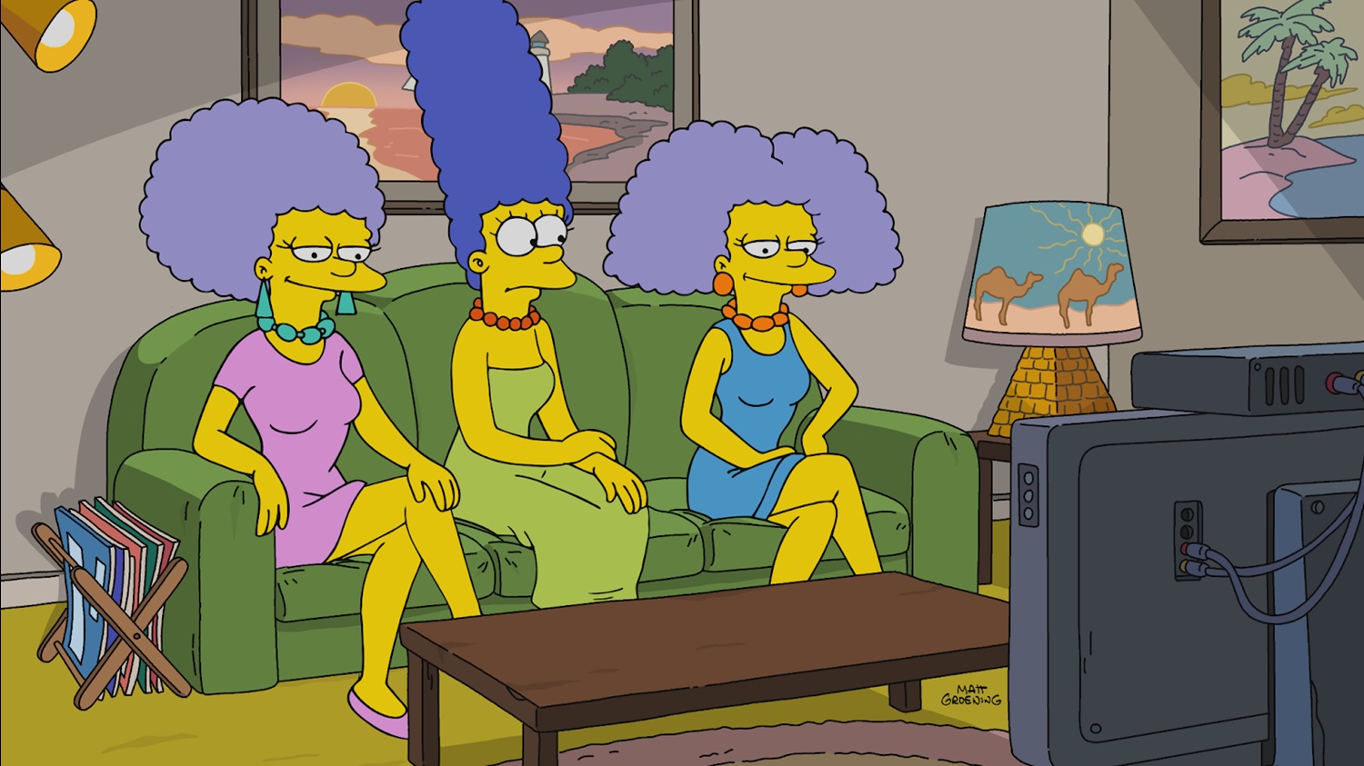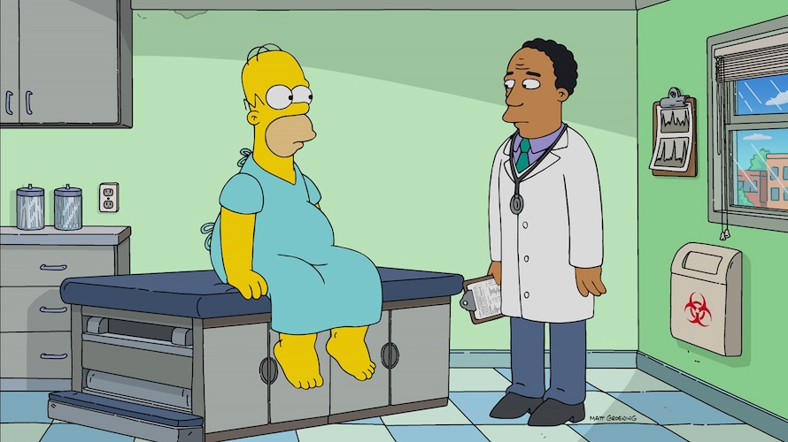 And when the Simpson family sees a news report about Othinquic delivered by a now-skinny Kent Brockman (Harry Shearer), Bart (Nancy Cartwright) asks his father Homer why he doesn’t go on the drug, and Homer insists that his wife Marge (Julie Kavner) loves him just the way he is. But Marge hesitates, saying that she wants Homer to “see Lisa graduate from college, and see Bart get a good deal on a used car." Soon Marge finds herself talking to an anthropomorphic Othinquic injector– this is never really explained, and I kept expecting her to wake up from a dream– and trying to convince Homer to go on the drug. There’s a clip from The Opal Show, a Simpsons-universe parody of The Oprah Winfrey Show, in which the host extolls the virtue of Othinquic and even gives it out to her audience, and then Marge meets with her now-thin sisters Patty and Selma (both also voiced by Kavner), who claim to have lost their weight naturally, though that’s clearly not true because they ask Marge if they can each borrow $900 a month. Coincidentally, Dr. Hibbert (Kevin Michael Richardson) is prepared to charge Homer $900 per month for his own prescription to Othinquic, considering most doses are going to those who need it the most: A-list Hollywood stars during awards season.
