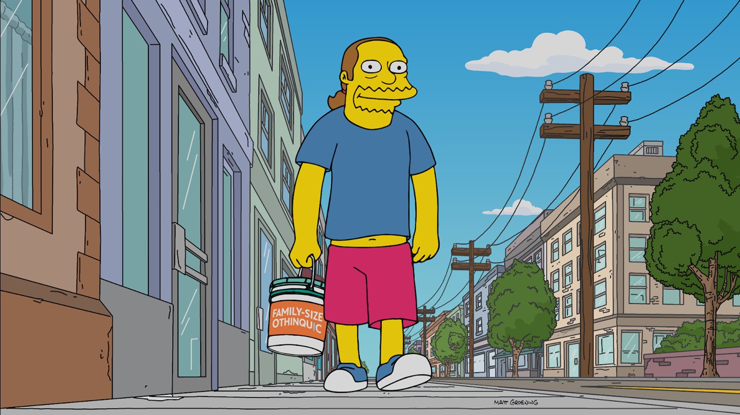 20+ years ago it was “Simpsons Already Did It" on South Park, and now it’s “South Park beat them to it" on The Simpsons. After a really fun pinball-themed couch gag, “Last Man Expanding" begins at Moe’s Tavern, where the usual barflies– including Homer Simpson (voiced, as always, by Dan Castellaneta)-- notice that something’s amiss. No, it’s not the missing letter grades above the bar– Moe has transformed these into a sign that reads “Drink DuFF" (hope he gets a “U")-- it’s Barney Gumble (also Castellaneta), who shows up late to this weekday morning drink-along because he’s been taking a trendy weight loss drug called Othinquic (basically Ozempic, you get it) that has also drastically reduced his reliance on alcohol, much to Moe’s (Hank Azaria) chagrin. And thanks to that blabbermouth Chief Wiggum (Azaria too), soon pretty much everyone in Springfield has lost weight due to… “diet and exercise," as they claim.
