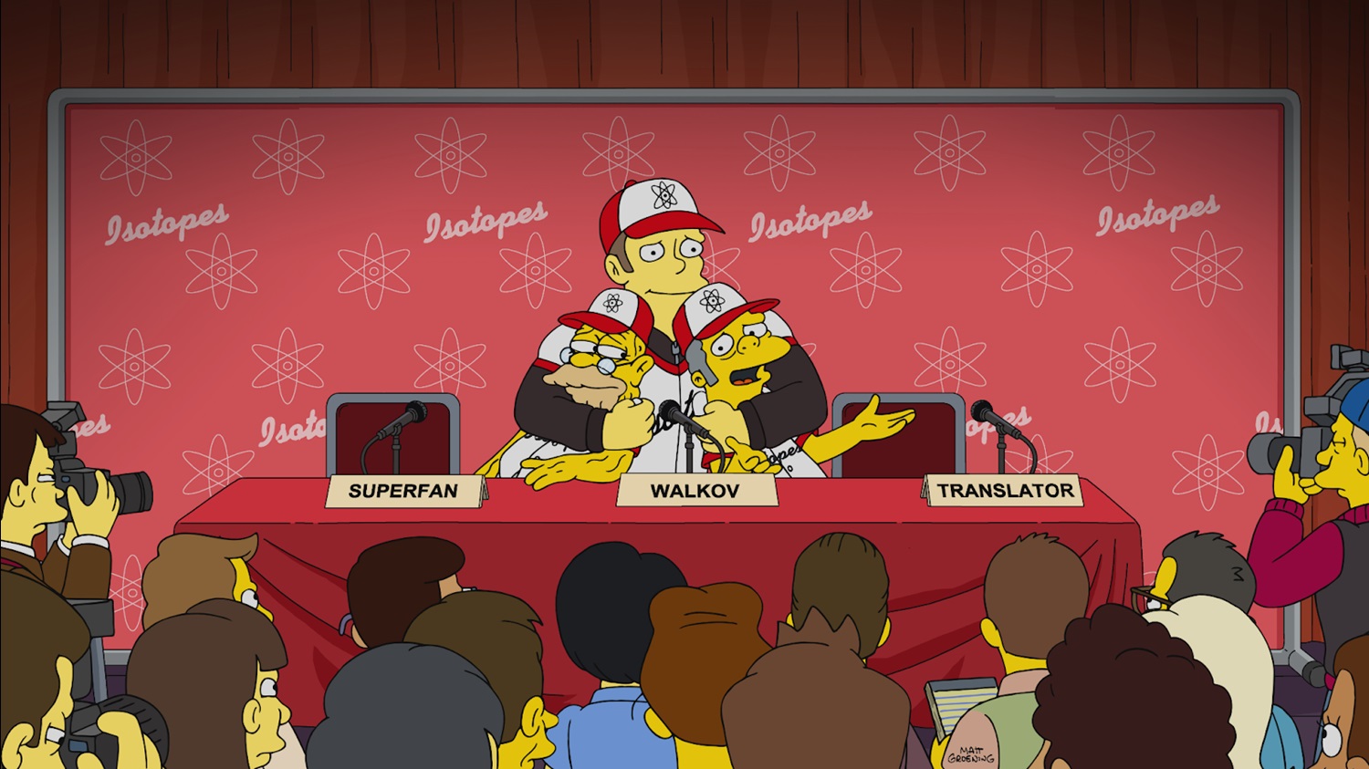 Moe, meanwhile, acts as Walkov’s interpreter for press conferences and other interactions with the locals. But the problems begin to arise when Abe becomes frustrated by the increased commercialism of the now-booming Isotopes ballpark– now renamed Toblerone Stadium– and the transformation of his usual seats into a lush VIP area that he and Bart can’t even access: their section “J" has been relocated the the super-nosebleeds above the clouds and the Duff blimp. Then Moe encounters an issue of his own when he finds Walkov betting on baseball using one of the many sports-betting apps that are being advertised around the stadium. Bart also becomes enamored by sports betting when he sees his heroes doing it, using Homer’s unconscious face to log in to his smartphone. This leads to a tense press conference wherein Moe attempts to mistranslate Walkov’s confession and Abe eventually confronts his still-relatively-new bartender friend.