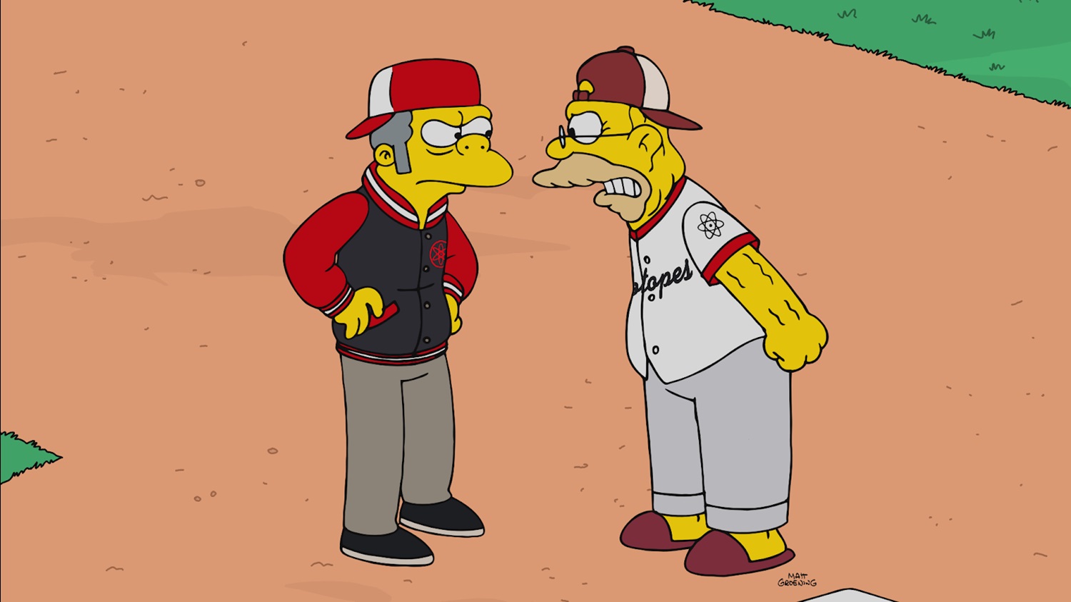 “Abe League of Their Moe" starts off with a flashback to long, long ago when a very young Abraham Simpson (voiced, as always, by Dan Castellaneta) attended a Springfield Isotopes baseball game with his own grandfather and together they carved their names into the railing in front of their season-ticket seats. “Someday you’ll bring your own grandson to a game," says Abe’s grandfather, and of course we dissolve to poor Abe sitting along in the same seat in the present. He’s so alone, in fact, that the only other attendees at that particular Isotopes game– seated way off on the other side of the stadium– is bartender Moe Szyslak (Hank Azaria). So Abe makes an effort to bond with Moe over their shared interest in being the only two fans left of this unsuccessful baseball team, and soon they find themselves attending each game together, even sometimes watching on the TV at the Springfield Retirement Castle.