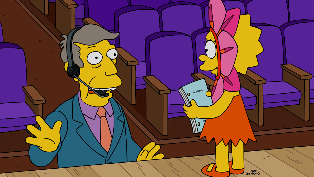 Marge suggests encouraging Hub's creative side, so after Spring Break ends Skinner pushes the boy to audition for the school play Peter Rabbit. Though hesitant, Hub lands the role of Farmer McGregor, but when Seymour learns that this role only entails a few brief lines, he takes over directing the play from Mr. Largo (also Shearer) and enlists Lisa Simpson (Yeardley Smith) to do a full rewrite, beefing up the McGregor role. Soon there are banner hung all over town advertising Hub's performance as Farmer McGregor, but when it comes to be showtime Hub comes down with a case of butterflies, which is not helped by his discovery that Skinner plans to adopt him permanently. Hub runs away, missing his cue, and Seymour chases after him in the playground. This is where the child's real parents show up and we learn that Hub had actually run away from a boarding school and camped out at Springfield Elementary because he liked it there more.