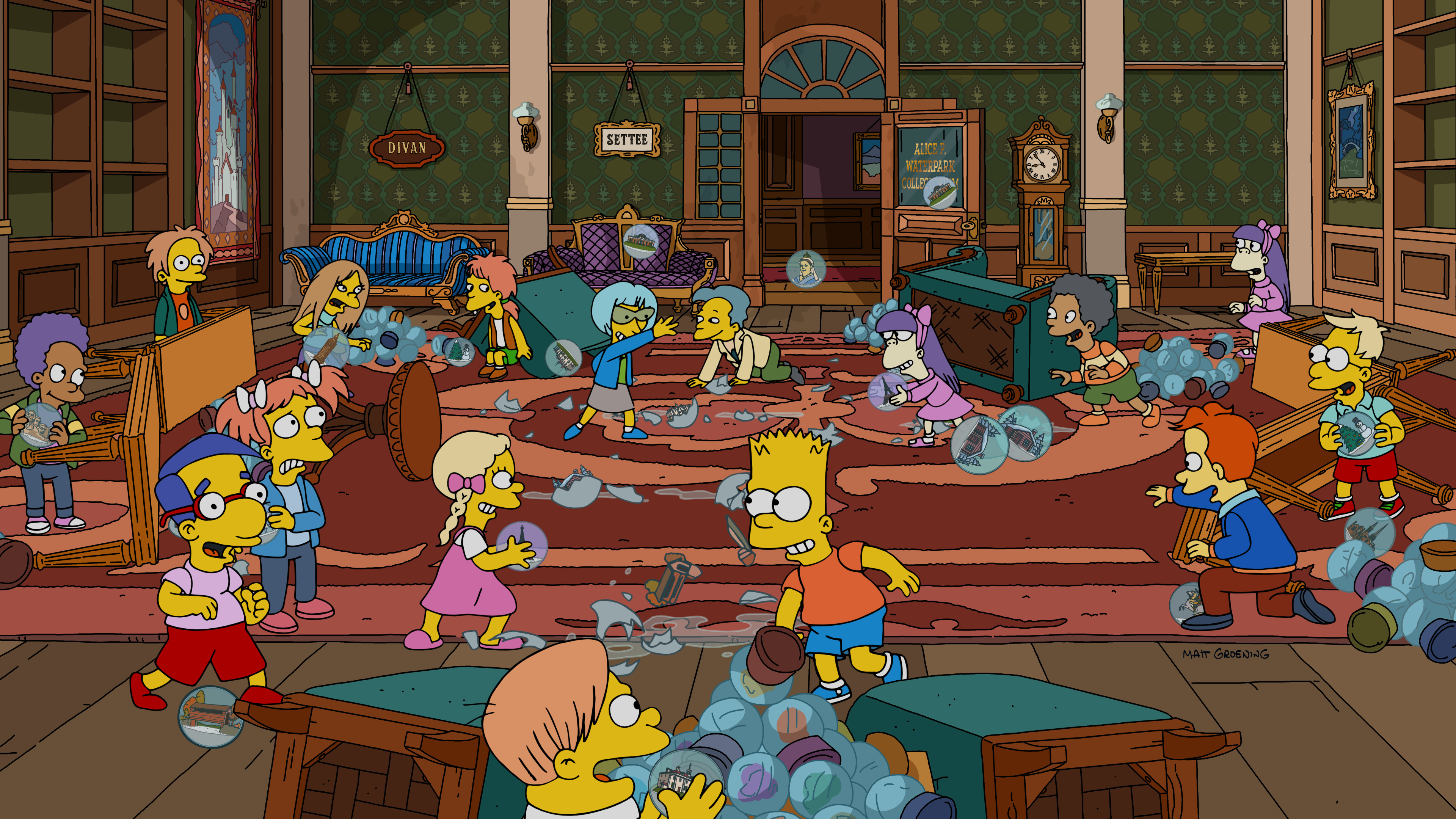 An exasperated Skinner returns home to find that his mother Agnes has gone on vacation for Spring Break, so he decides to spend his own time off back at the school, filling out textbook requisition forms. That's where he hears a noise in the middle of the night and wakes up Groundskeeper Willie (also Castellaneta)-- who still happens to be married to Karen Gillan's character Maisie MacWeldon-- and the two of them track down the source of the disturbance: a boy named Hub (guest star Kieran Culkin from Succession) who has been living in the library. Hub claims to be a ghost, scaring Willie off, but Seymour knows better and takes Hub to his office for a grilling. Hub makes up an obvious lie about how his parents died-- which becomes a running gag throughout the episode-- but since Skinner can't get the actual truth out of the boy, he takes him home and lets him stay in Agnes's sewing room. When Hub continues to act up (there's a clever sequence where the boy nearly drowns n a ball pit and Skinner saves him) Seymour visits the Simpson home-- newly purchased hat in hand-- and asks Marge and Homer for advice on dealing with a troubled kid.