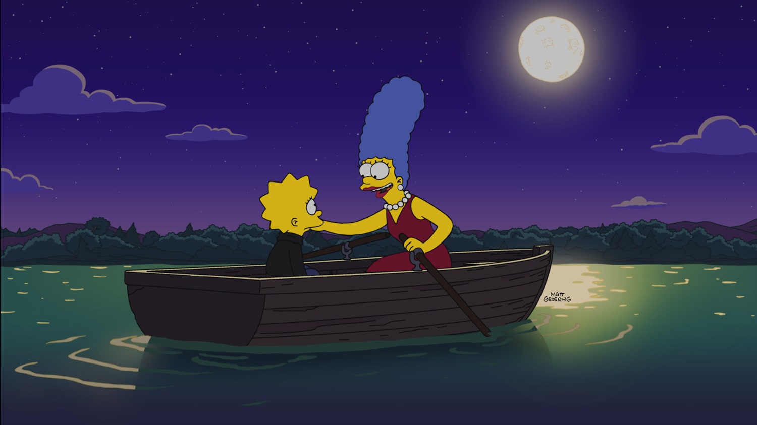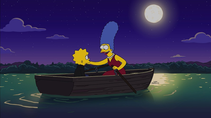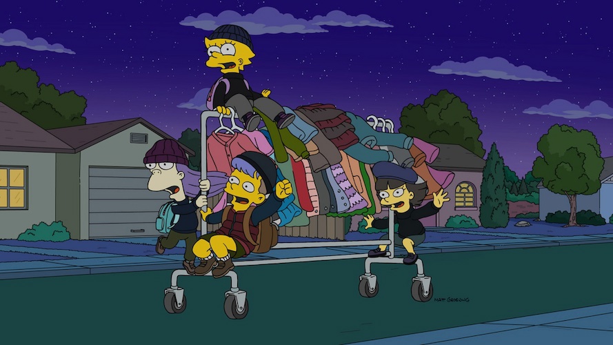 The scheme is for all of the moms to be drawn out of their homes by a mother-son dance at Springfield Elementary School (thankfully Principal Seymour Skinner– voiced by Harry Shearer– and his mother Agnes– Tress MacNeille– have hit a rough patch lately), while the dads are distracted by the same violent streaming show that has Bart and Homer engaged. But Martin’s father Gareth (Chris Edgerly) hears a noise from his attic and calls the cops, so Lisa and her new friends are forced to make a hasty escape. But when Lisa’s backpack breaks the lattice via which they are egressing, she panics– only to be saved at the last minute by Marge, who has discovered the plan for the heist at the school while there for the dance. This famous mother-and-daughter duo share a nice moment on a lake inspired by their favorite 90s teen drama, and Marge then makes the kids return all the clothes they stole, except for a t-shirt that replaces one of Marge’s that got ruined during the drama.
