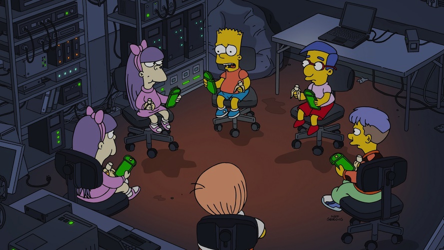 Stripped from their phones, the kids enlist Martin Prince (Grey DeLisle) to help them find a way to get Chalmers fired, even though Bart used to like him because he yelled at Principal Skinner (Harry Shearer). The solution is hoisting him by his own petard– the board of education is alerted to minor citational errors in Chalmers’s Masters thesis, and he is let go due to technicalities. Saddened, Chalmers heads to Moe’s Tavern, where proprietor Moe Szyslak (also Azaria) attempts to comfort him with beer, but no job means no money, so Moe’s tap sucks all the beer back up out of the glass. But after being bored by his stories (“We hoped he would be our Frasier, but he turned out to be our Rebecca.") Homer and the other barflies decide to help get Chalmers a job at the Nuclear Power Plant.