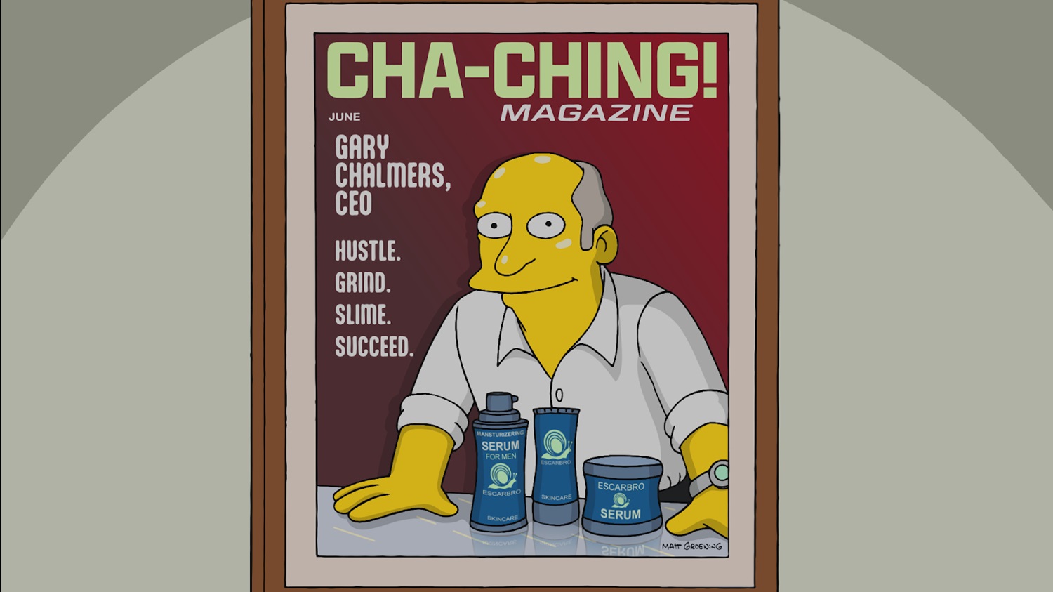After he returns home from his workday covered in mutant snail slime, Gary is told by his daughter Shauna (Tress MacNeille) that the slime could actually be worth a fortune as a skin moisturizer treatment. So Chalmers goes into Burns’s office the next day, strips off his janitor coveralls to reveal a three-piece suit (“A businessman!" exclaims Burns) and pitches a plan. Next thing you know, Gary Chalmers is riding high as the CEO of Escarbro, which proves to be a smash-hit with middle-aged men.