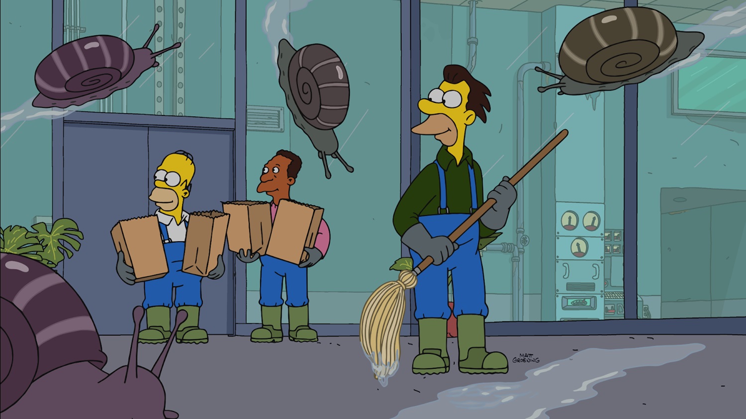 So Chalmers begins working as a “super-custodian" at the Power Plant, where Homer tells him he’s putting in too much effort and teaches him how to goof off– cutting 110% in half to become… 55%? “No, that’s still too much." Unfortunately the plant’s owner Mr. Burns (also Shearer) catches Gary loafing, so he has Smithers (Shearer once more) punish him by having him clean the tunnels behind the cooling towers. There, Chalmers discovers a race of enormous mutated snails that attack him… very slowly… and this is where things begin to get weird.