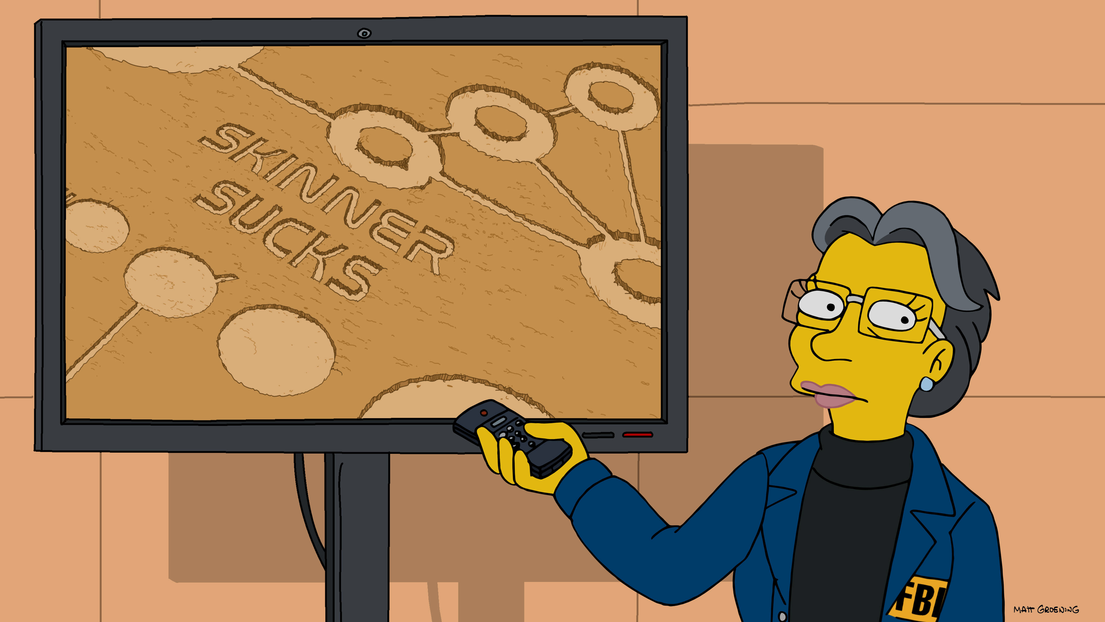 In the final scene, as they're walking away from the Circulus, Bart confesses to Lisa that he didn't actually use his face to set up his phone's security... and that during his escapade he was able to gain access to the room that controls the images on the venue's exterior. Here's where we and Lisa figure out that instead of his face, Bart used his own posterior to unlock his phone. Case closed. Over the end credits, we see that The Simpsons production staff utilized motion capture technology to create the choreographed dance numbers for the Kneesock Dolls. And I have to say, I thought "The Day of the Jack-Up" was a pretty strong entry, during which I found myself chuckling a good number of times. I admired the structure and resolution of the episode quite a bit and, having seen Trap, I definitely appreciated the skewering of that particular film. Heck, we even got a bonus Shyamalan reference in the form of a crop circle formation, a la Signs (see image above). Really solid outing!