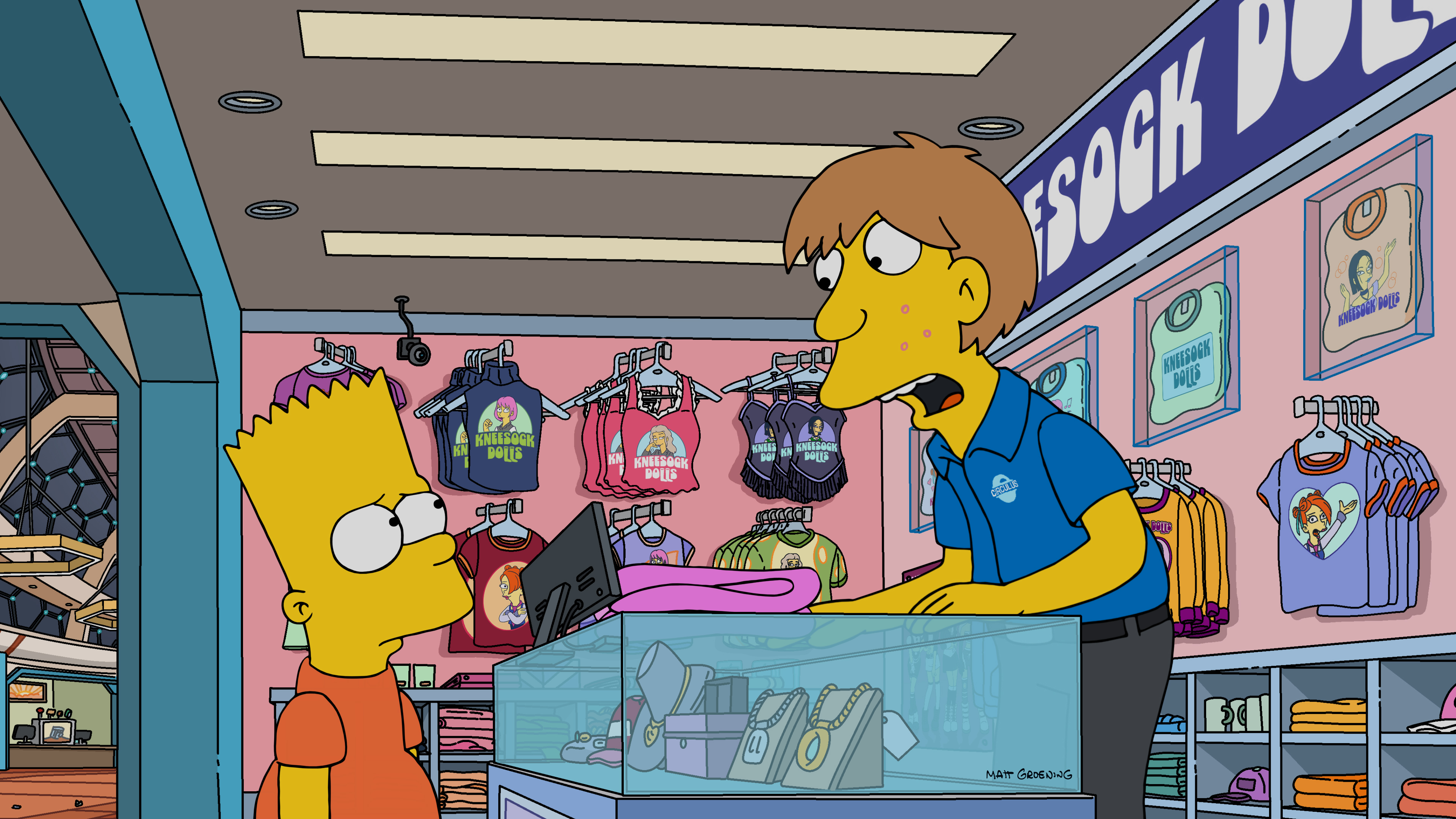 So Homer, Lisa, Marge (Julie Kavner), and Bart (Nancy Cartwright) all go to the Kneesock Dolls concert together, but Bart only lasts about a minute before he decides to get up and go wandering around the venue. At the merchandise stand, he's informed by the Squeaky Voiced Teen (also Castellaneta)-- whose name is given in this episode as Andrew Freedman-- that the whole concert is actually a trap set up to catch the SeatMiser. And here's where it dawns on us, the viewers, that "The Day of the Jack-Up" is a parody of writer/director M. Night Shyamalan's 2024 thriller Trap. We also learn in this scene that (SPOILER ALERT) Bart himself is in actuality the SeatMiser.