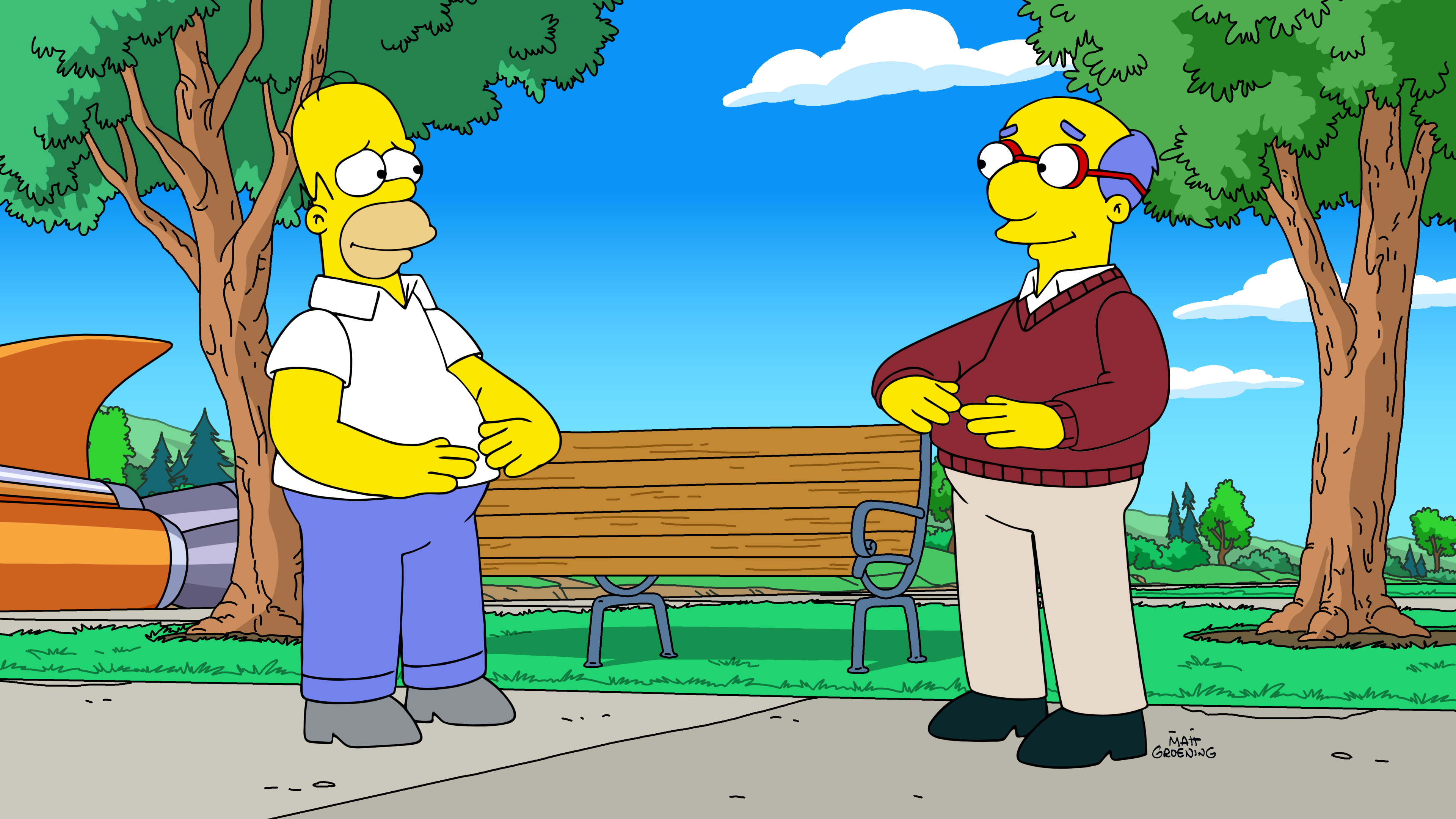 Later, Homer (also Castellaneta) is dropping Bart (Nancy Cartwright) off at his friend Milhouse's (Kelly Macleod) house, but he insists that Bart jump out of the car while it's still moving because Homer doesn't want to have to talk to Milhouse's dad Kirk Van Houten (Hank Azaria). Unfortunately for Homer, as he's driving away, Kirk jumps on the hood of his car and insists that Homer check out his new sprinkler that rotates a full 360 degrees-- it doesn't work upon demonstration. Both Homer and Bart are then forced to spend the night at the Van Houten home because of a "shelter in place" order due to the crazed animals rampaging around town. During their visit, after drinking the water that the spaghetti was cooked in (it does have all the nutrients), Homer confesses to Kirk that he and Marge's love life is suffering because of him getting too many cracker crumbs in their bed.