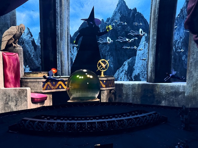 The first big effect arrives during the cyclone sequence. Seats rumble, wind machines rise from the floor, and confetti leaves swirl through the foggy air as thunder roars overhead. The witch even flies directly toward the audience, a scene cleverly repurposed from later in the film. It’s pure theme-park spectacle, reminiscent of Universal Orlando’s retired Twister… Ride It Out.