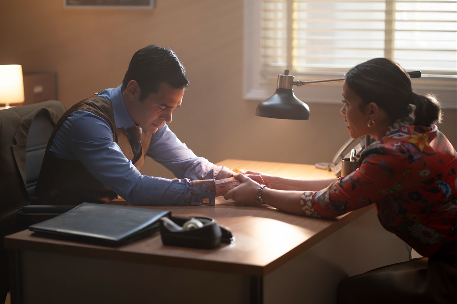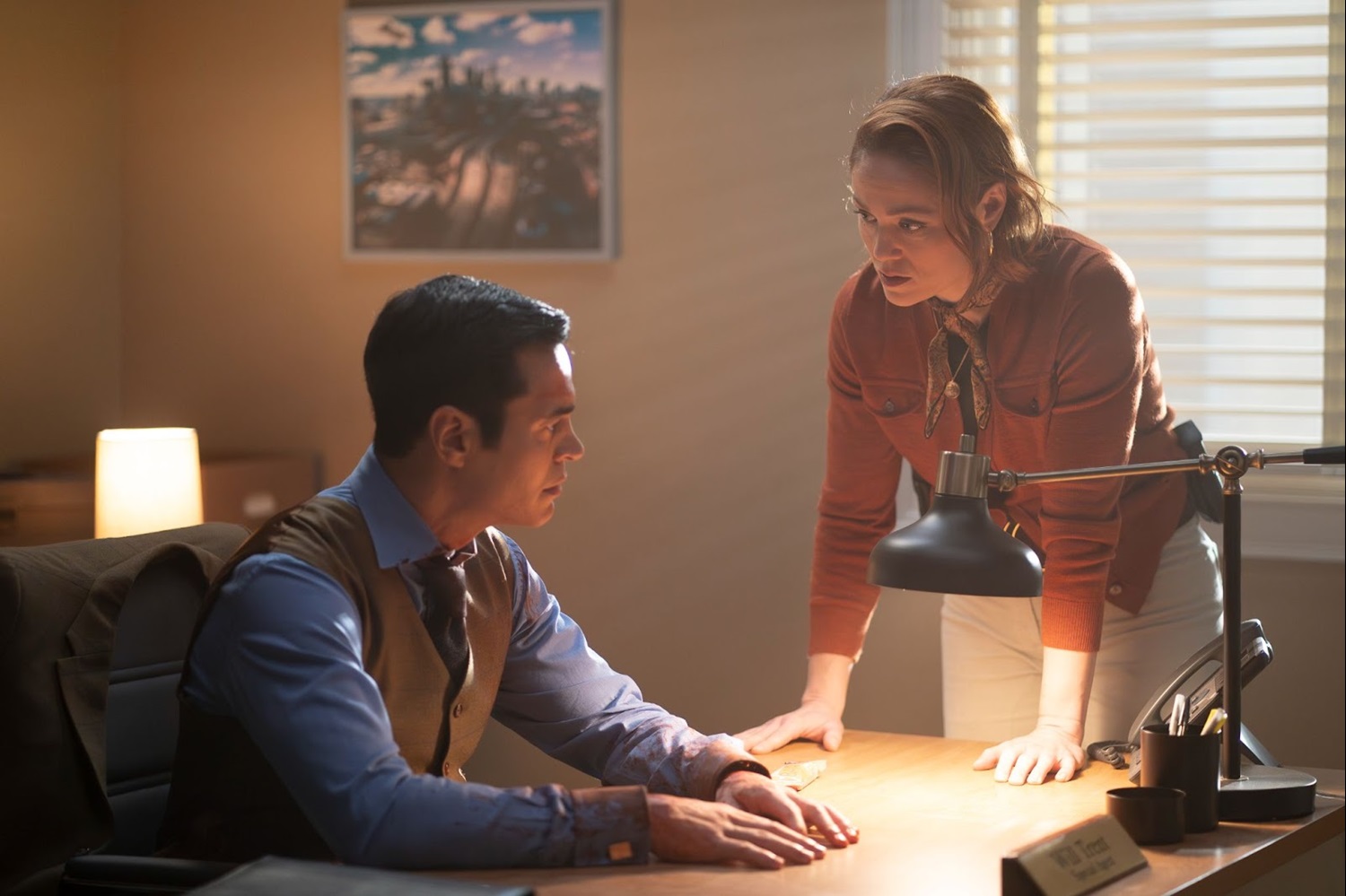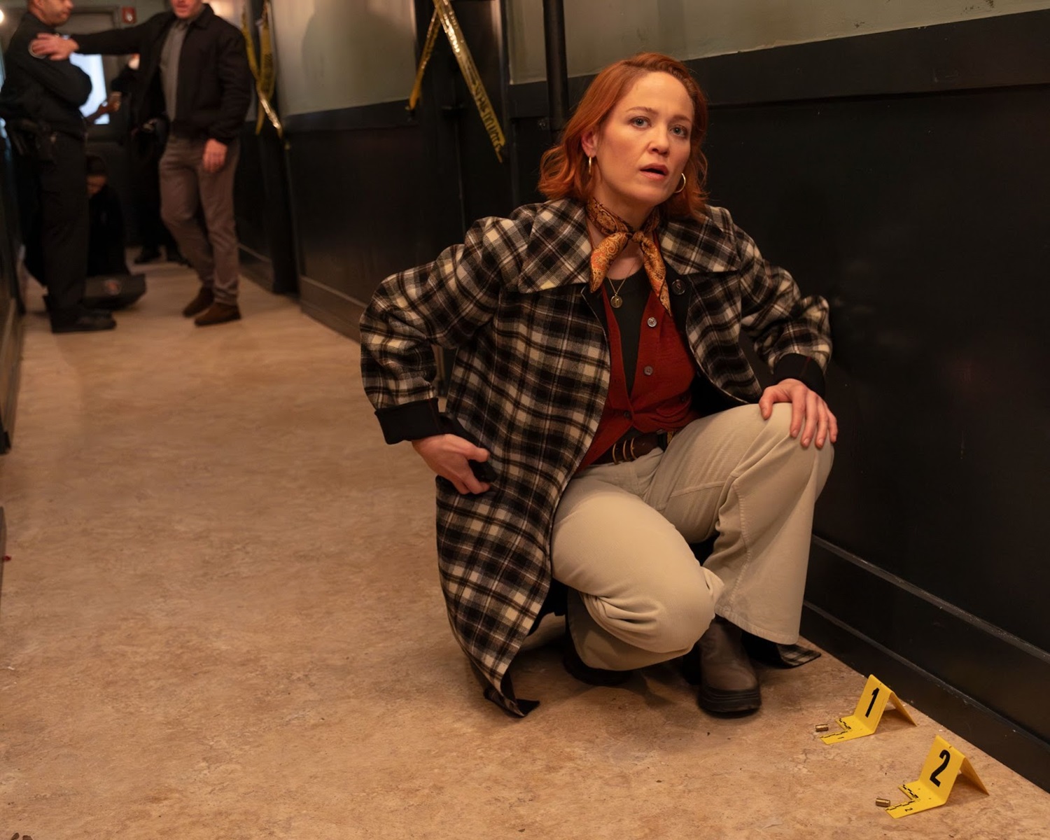 Angie and Ormewood go to the apartment building to assist with the investigation. As Angie looks at a bullet casing on the ground with an evidence marker, she notices a woman with a red scarf peeking out at the activity in the hallway. There aren’t any security cameras in the building, and there weren’t any eyewitnesses to back up Will’s story. Another officer, Randolph (Drez Ryan), tells Angie that the woman hasn’t been willing to talk to the police. Ormewood asks Randolph to go get some tacos while he and Angie try to work with the neighbor. Angie notices that the doorbell is a kind used by deaf people. The woman, Ruth (Deanne Bray), tells them to go away, and her daughter, Lily (Margot Anderson Song), comes to the door to assist. Angie uses her notebook to write a message, asking if they can help answer a few questions. Lily reluctantly lets them in.