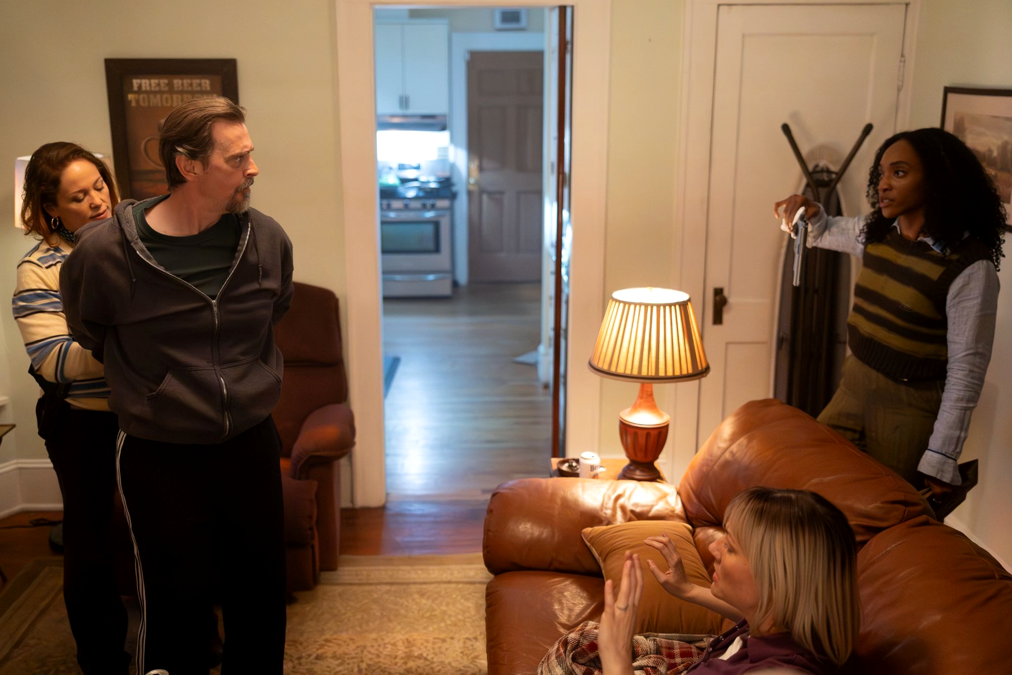 Will and Ava descend into Murph's basement, a silent disco where everyone is dancing to “Shout.” They spot the urn on a pedestal display. Will and Ava dance through the crowd inconspicuously, bumping together in a quietly romantic moment. Reaching the urn, Will sets down cash matching what Murph paid. They begin to leave, but Murph comes downstairs and puts on headphones to join the party. Will guides them toward the stairs, shielding the urn behind dancers. Then the music hits the "a little bit softer now" portion of the song, and the entire crowd crouches low, leaving Will and Ava exposed. Murph spots them and yells at them to put it down, instructing his partner to call the police.