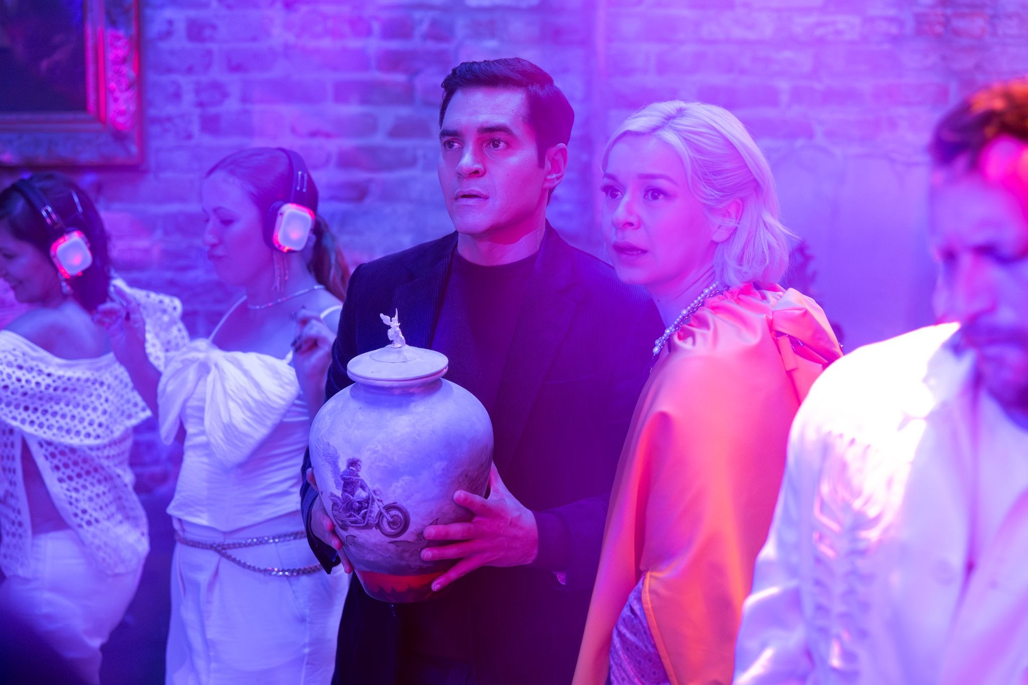 Will and Ava descend into Murph's basement, a silent disco where everyone is dancing to “Shout.” They spot the urn on a pedestal display. Will and Ava dance through the crowd inconspicuously, bumping together in a quietly romantic moment. Reaching the urn, Will sets down cash matching what Murph paid. They begin to leave, but Murph comes downstairs and puts on headphones to join the party. Will guides them toward the stairs, shielding the urn behind dancers. Then the music hits the "a little bit softer now" portion of the song, and the entire crowd crouches low, leaving Will and Ava exposed. Murph spots them and yells at them to put it down, instructing his partner to call the police.