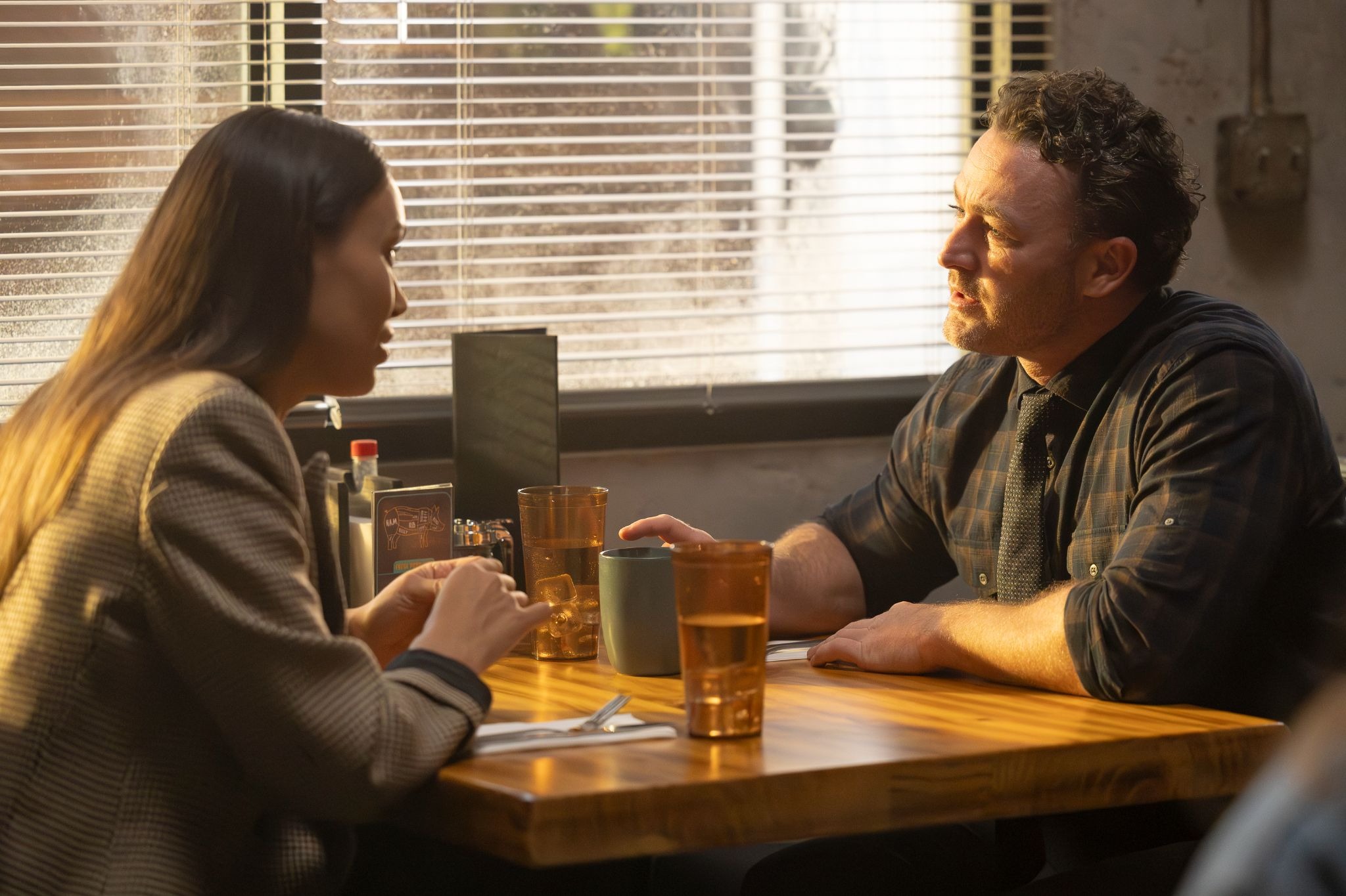 Ormewood and Angie (Erika Christensen) meet with Joanne and Harris. Harris explains he heard gunshots in a parking garage across the street from a restaurant. When Ormewood asked him if he saw anything, he described George Long — but Harris only saw George walking down the street and panicked when Ormewood questioned him. Ormewood pushes back: Harris was brought in days later to make an ID. Angie notices that Harris seems drunk and accuses Joanne of manipulating the witness. Harris, panicked, apologizes again.