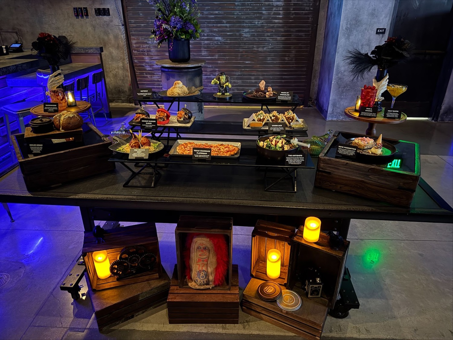 During my visit, I had the wonderful opportunity to interview five representatives from Universal Horror Unleashed: General Manager Kim Scott, Vice President of Entertainment Art & Design TJ Mannarino, Show Director Nate Stevenson, Assistant Director of Live Entertainment Alicia Benneche, and Executive Sous Chef Ryan Casarez. In the embedded video below, you can watch as they tell me all about the experience, intercut with a tour of the themed areas outside of the haunted houses themselves.
