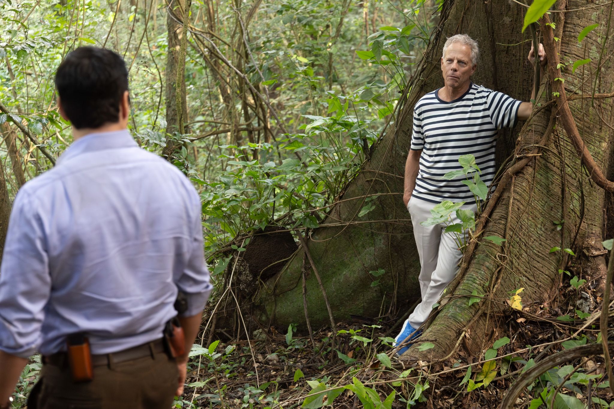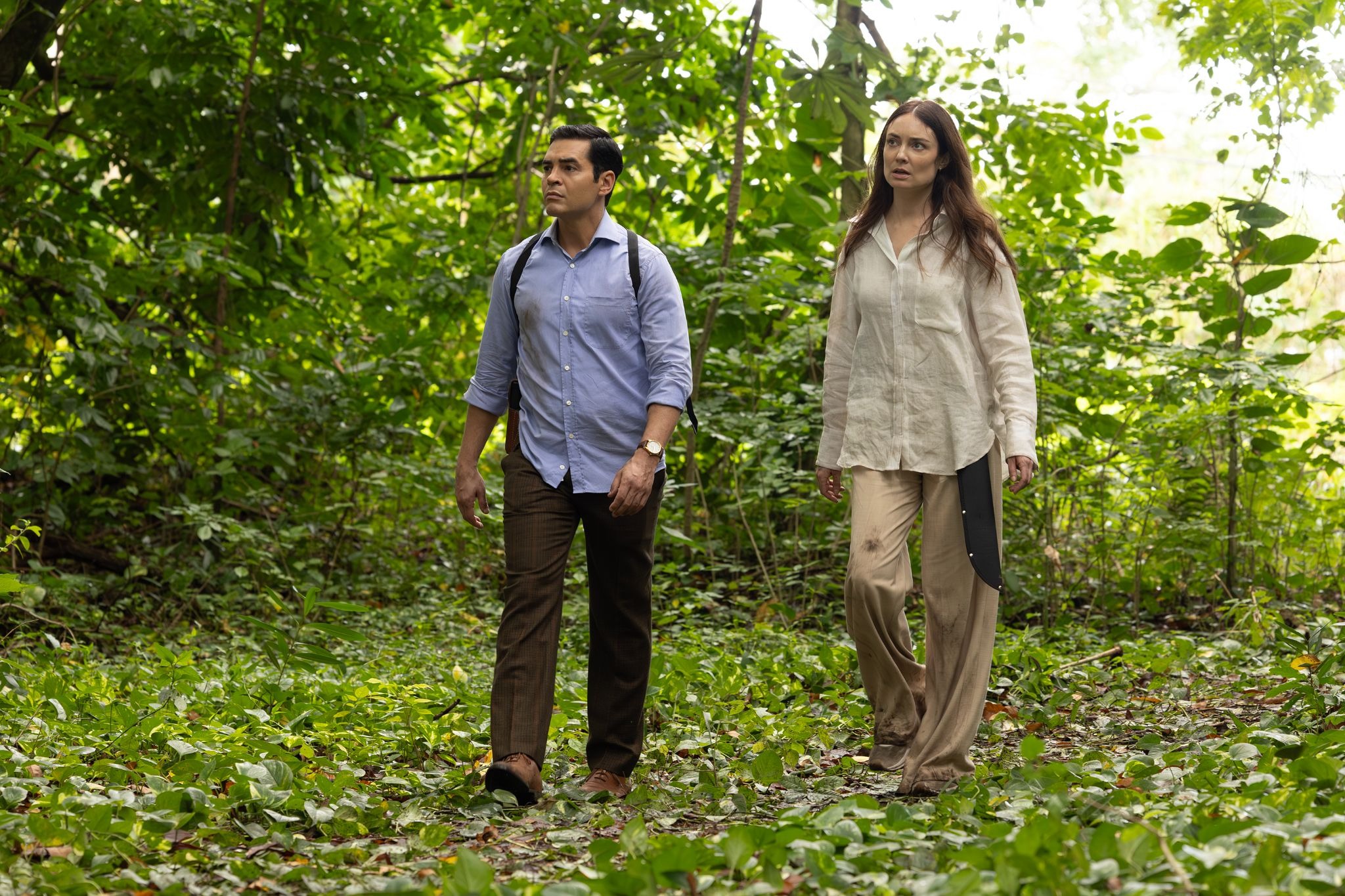 Will and Lana push into the jungle. The signal cuts out. In an unsteady moment near a cliff's edge, Lana nearly falls — Will grabs her, and they lose the bag containing her phone in the process. The recovery is intimate: Lana lands on top of Will, face to face, lips close. She apologizes for losing the phone. They hear a baby crying and follow the sound to a remote hut.