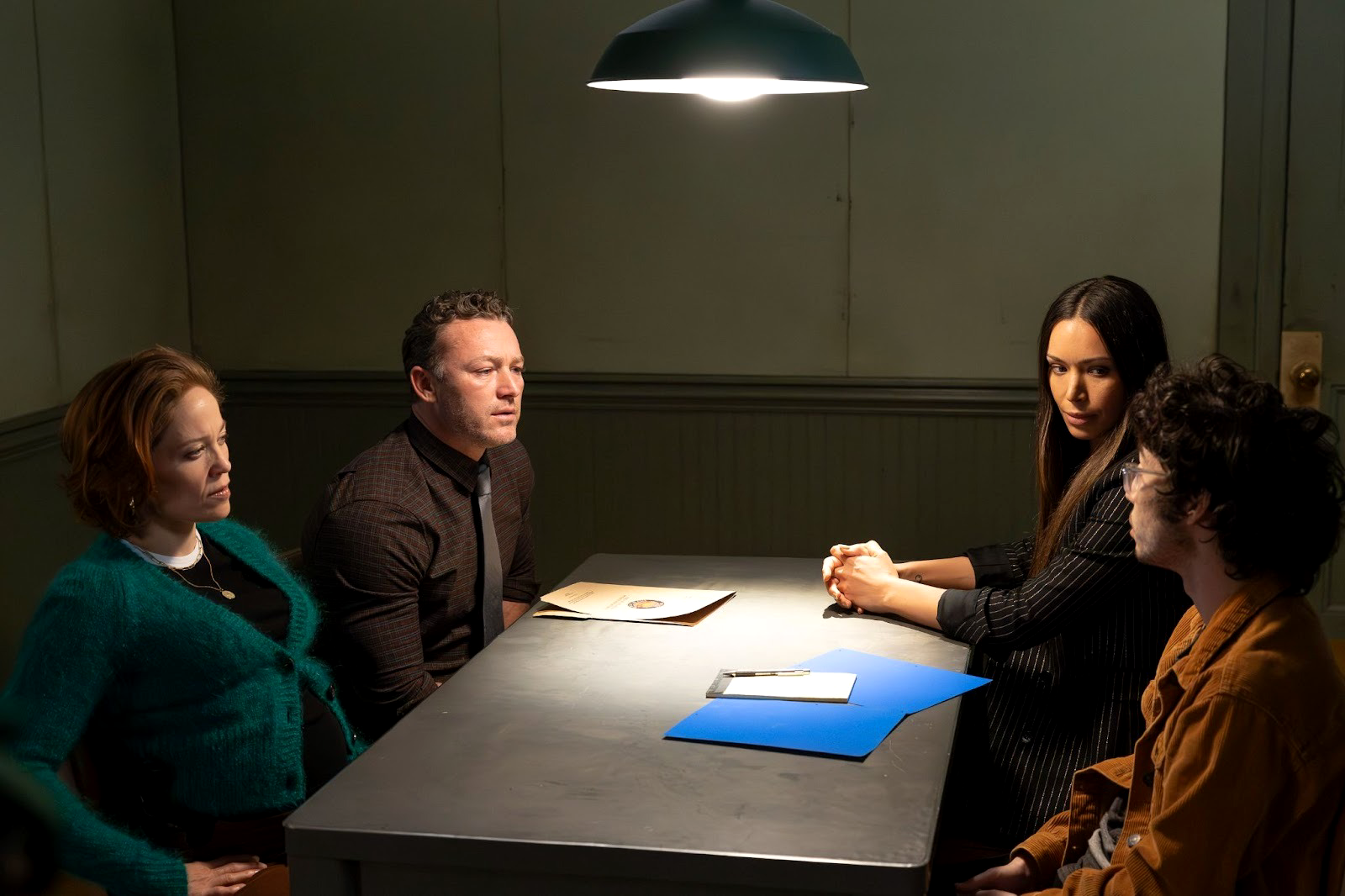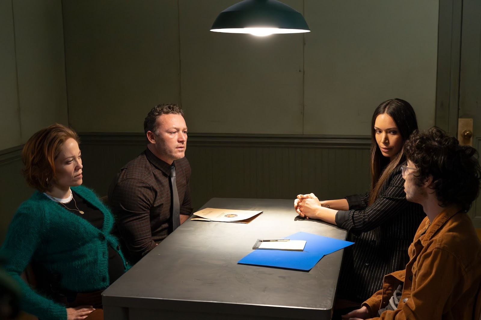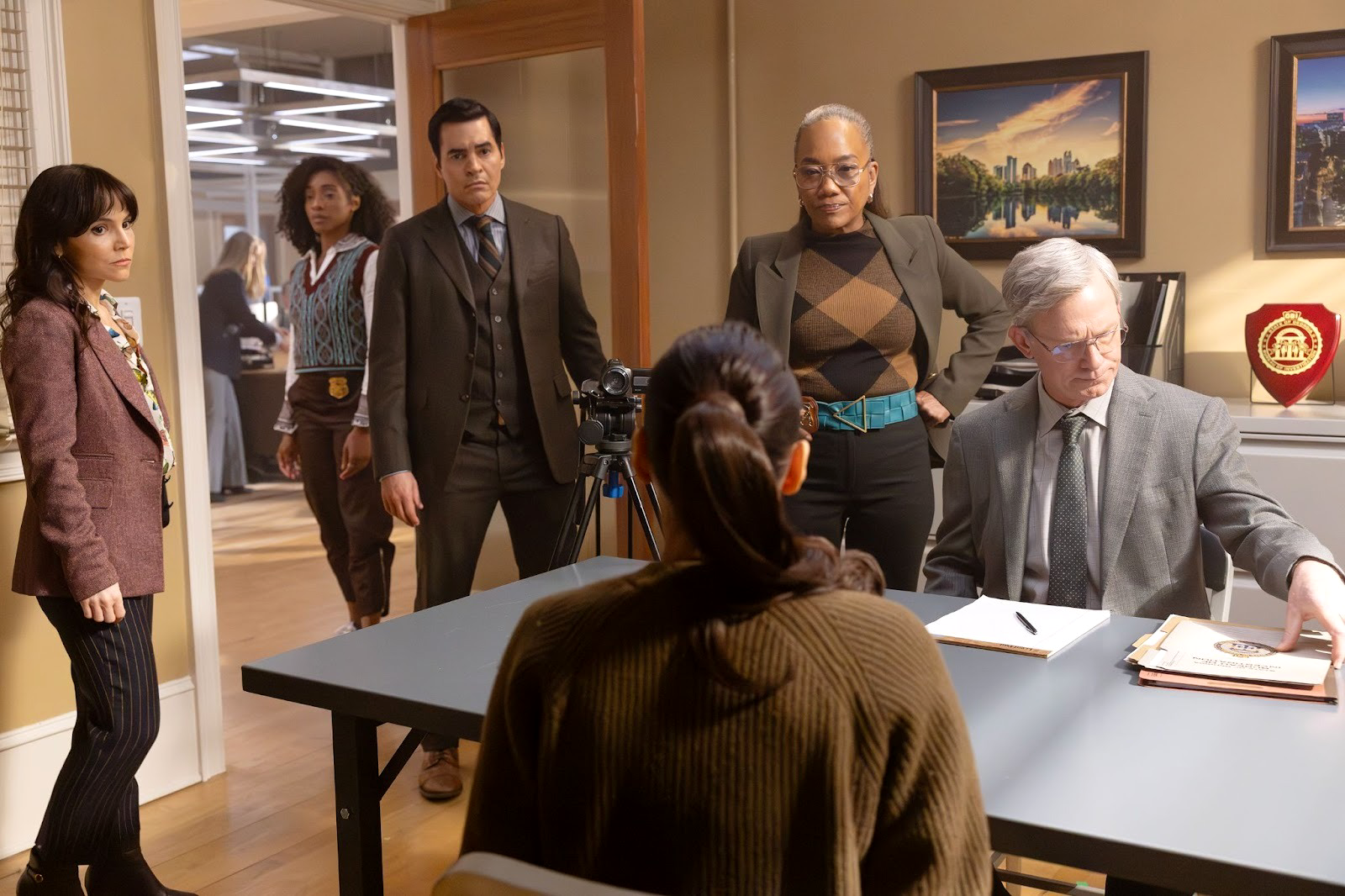 In the GBI conference room, Deputy Director Bill Appleyard (Jason Davis) is already angling. Will and Faith watch a live stream of Casey's interrogation: she came home to find Dallas trashing the place, drunk and violent. She locked herself in her bedroom, called Amanda instead of 911, grabbed the gun to defend herself, and shot him when he attacked. It's a coherent self-defense narrative — until Appleyard starts poking at the details. He brings up the affair with Amanda, the restraining order Dallas had previously taken out against Casey, and most damningly: "Was your girlfriend on the phone telling you how to do it, or just how to stage the crime scene?"