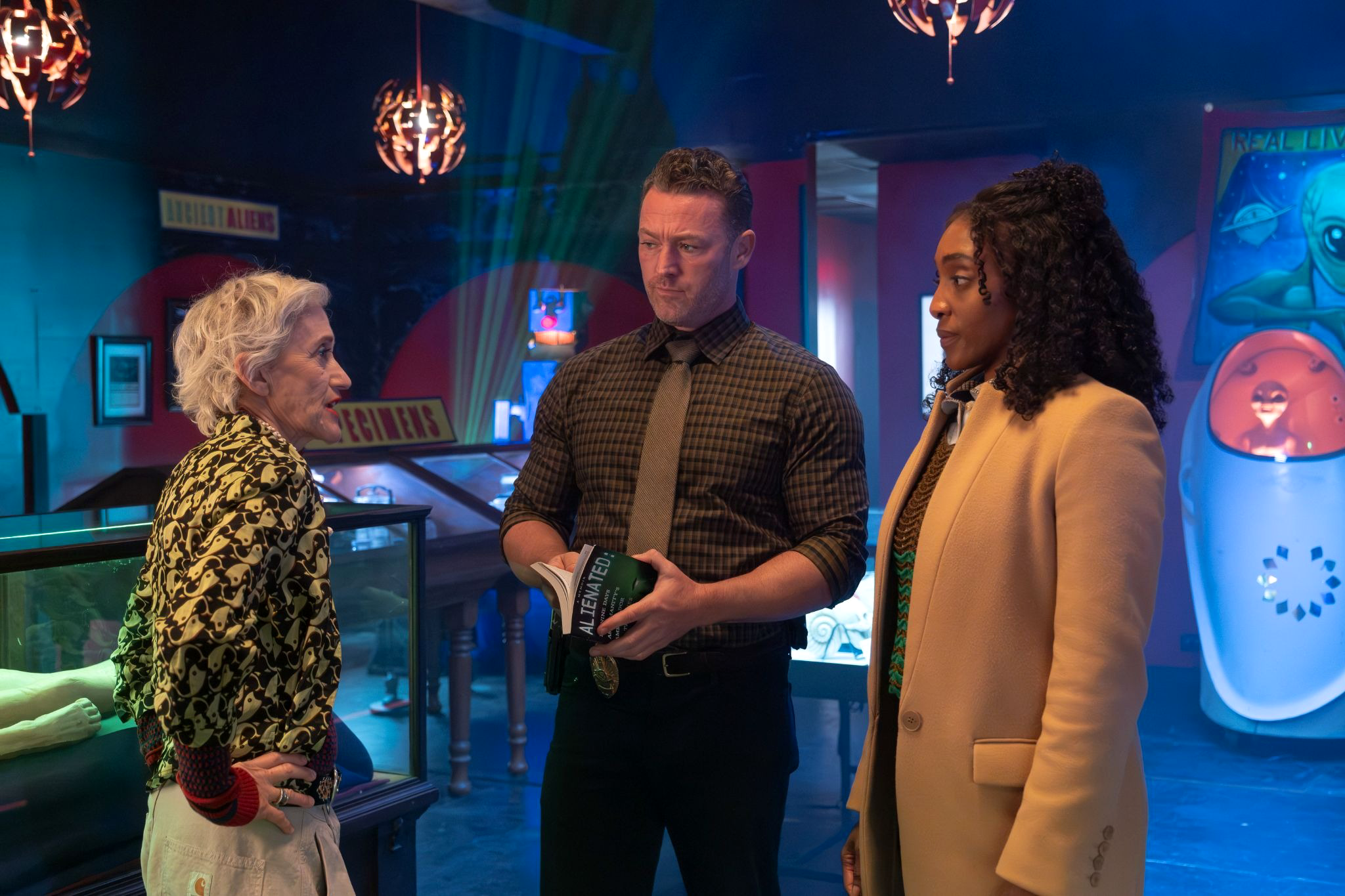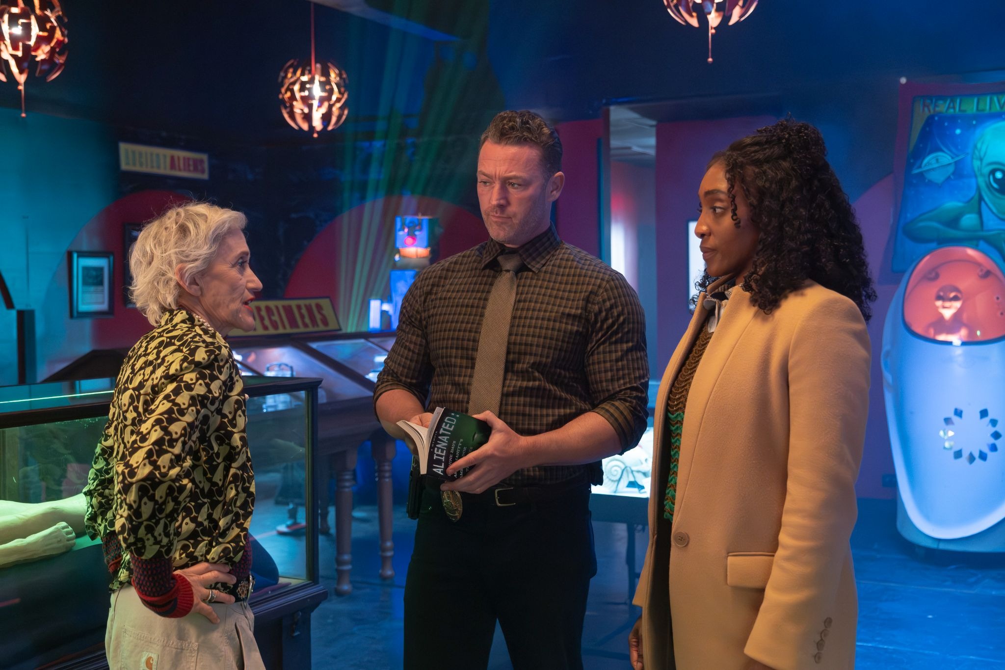 The cartoony alien on the sign at Shelly's Alien Emporium is posed the same as in the girl’s drawing. Inside the dark shop full of neon lights, they meet Shelly (Constance Shulman), who greets them with the energy of someone who has been waiting decades for law enforcement to show up. She reported her own abduction in 1972. Nobody followed up. When Faith shows her the girl's drawing of the alien figure, Shelly doesn't recognize the specific symbol — but she recognizes the girl. She'd seen her at the hotel diner down the street, eating with her grandmother. "Sometimes aliens shapeshift," she offers helpfully. She remembers the girl staring at her, haunted.