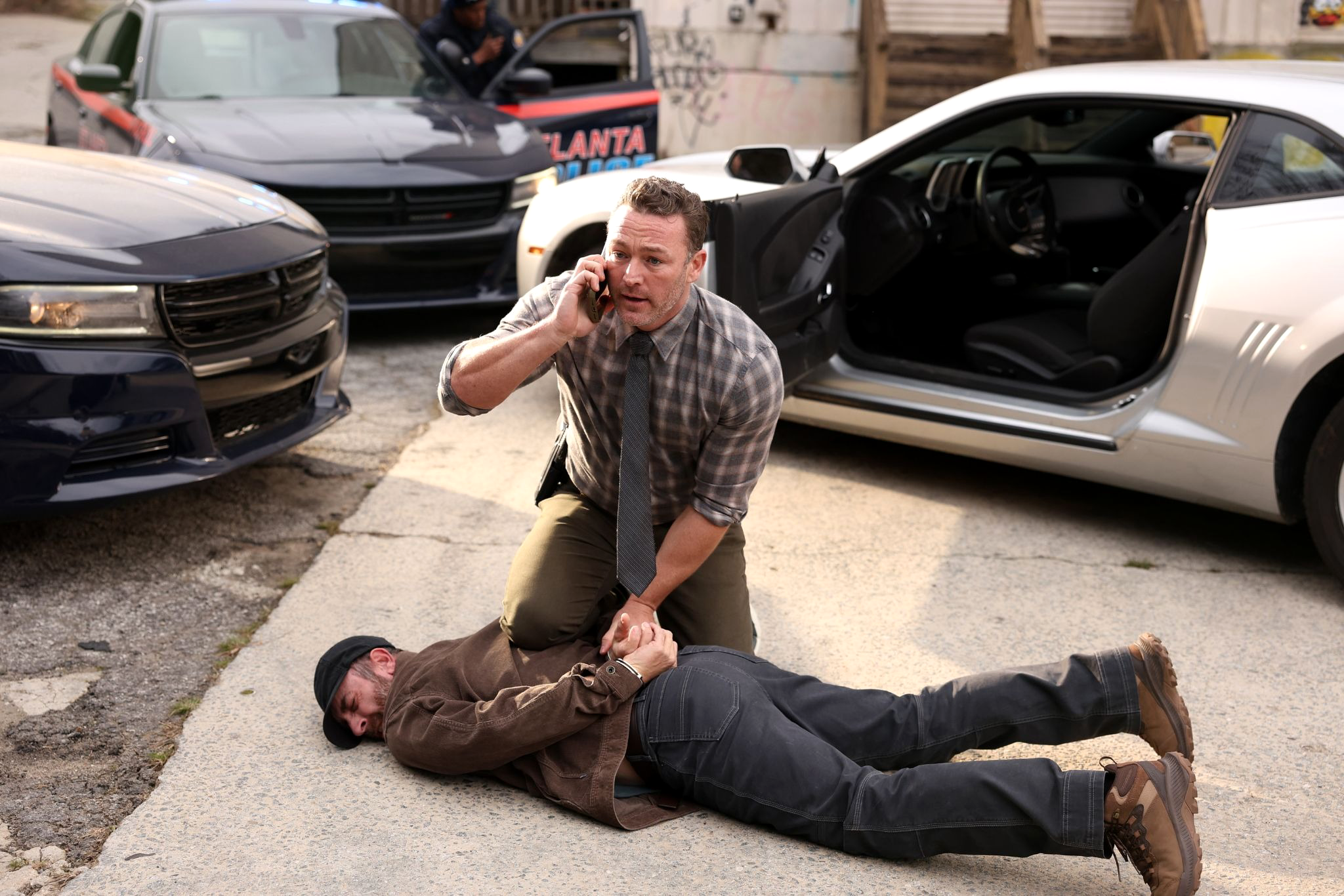 Faith and Ormewood are in a parking lot when they spot a very tall man (Stephen A. Fabian) — the tall man Grace described — speaking to a woman near a rental truck. Ormewood runs the plate: it matches the footage. They both draw their weapons and move to apprehend him. A silver Camaro screeches into the lot, scattering their focus, and the tall man bolts. Ormewood jumps in his car to pursue the Camaro. Faith stays in the lot alone, searching. He attacks from her blind side and takes her gun. She takes him down anyway — a tire wedge on a rope, a glass bottle to the head, a knee to the groin — and locks him in the back of the truck. She calls Ormewood. He caught the driver. "Let's find these girls."