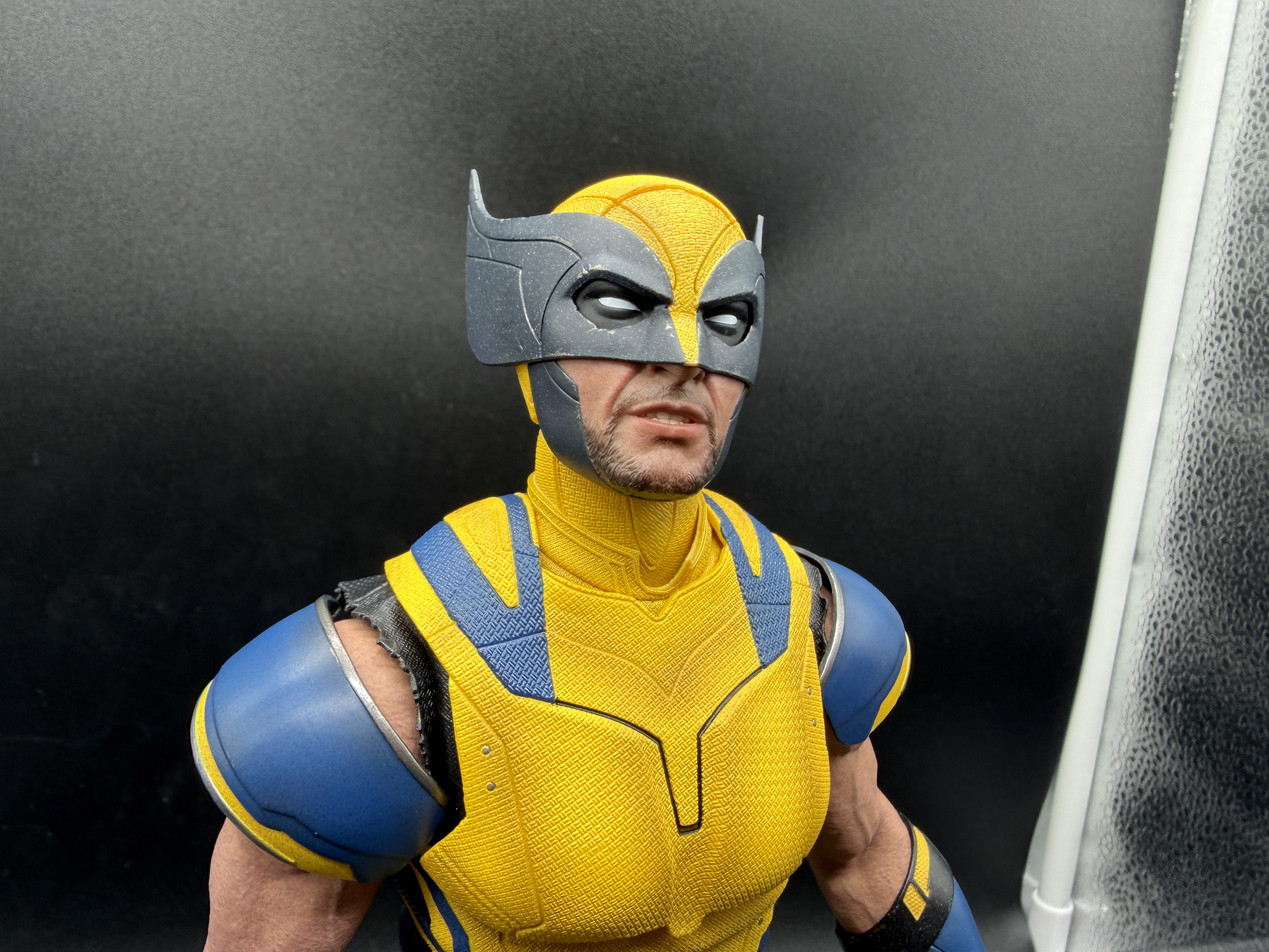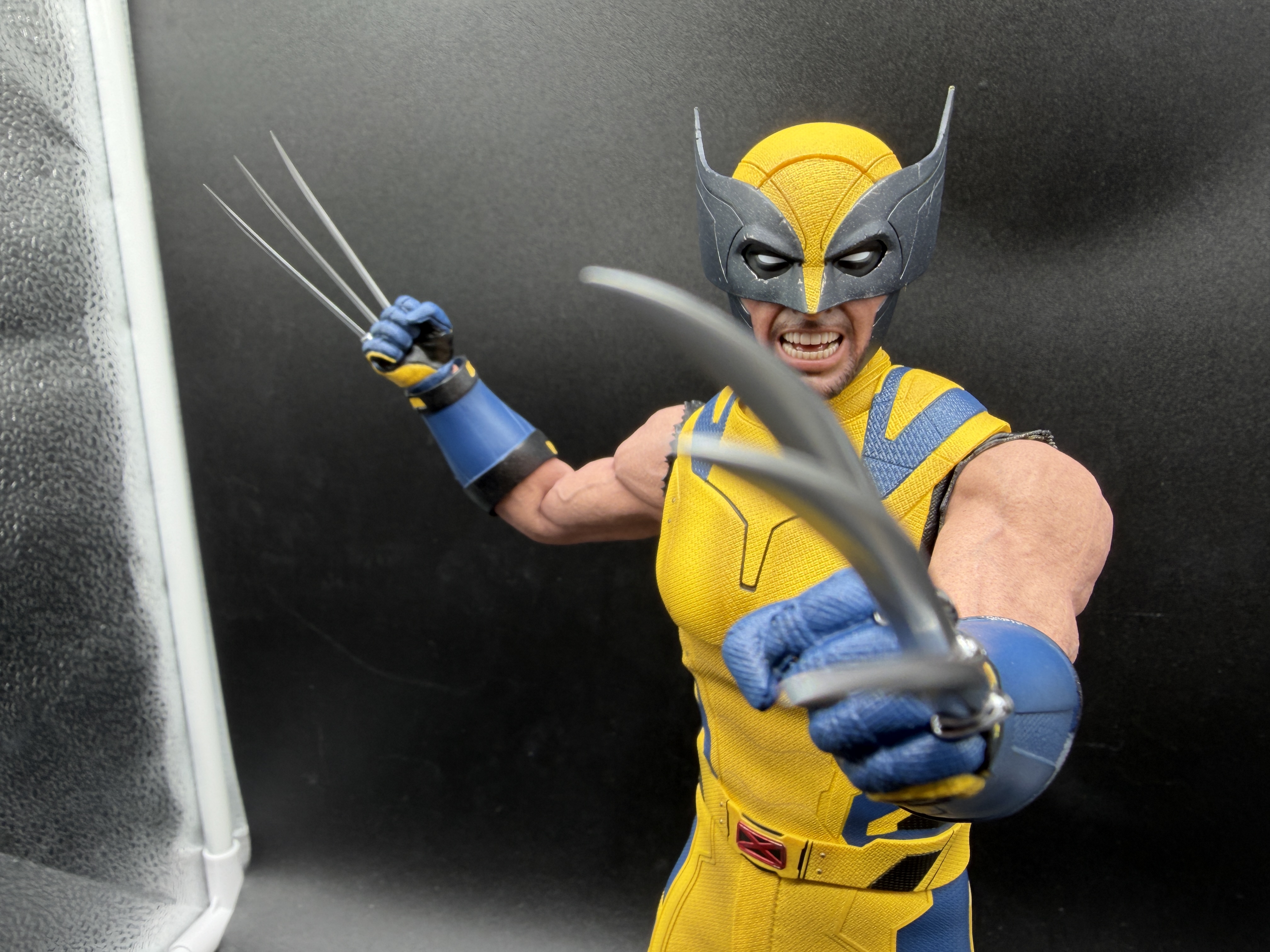 That's quickly fixable fortunately, via changing up the placement of those magnets and shouldn't be a problem unless you've got a kid actually actively playing with this figure (which you shouldn't do, because man, this is way too pricey for that!). So yeah, I suspect there were good reasons they didn't use this exact look in the movie, but regardless, we now have this figure able to even more closely look like Wolverine's stepped right out of the comics, and it's pretty much perfect. Because by comparison, take a look at that photo below, where he's sporting his exact look from the big fight against the Deadpool Corps in Deadpool & Wolverine. He still looks good, absolutely, but come on... That dude could use some snazzy shoulder gear!