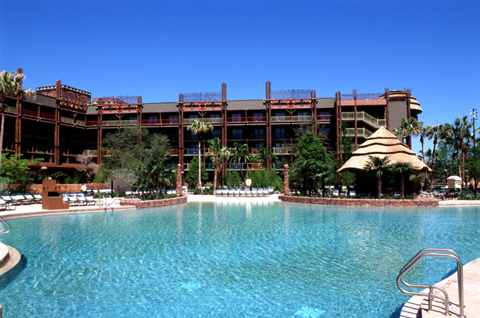 At over 11,000 square feet, the Uzima Springs pool is the largest on Disney property. A 67-foot long slide and kiddy wade pool area is also available for guests. The Uzima pool is open 24 hours, but the lifeguards go off duty at 10:00 PM and the slide also closes. The resorts two spas close at midnight. Standard room amenities: Alarm clock with MP3 player, balcony or patio, mini fridge, ceiling fan, coffee maker & setup, crib: pack 'n play, hair dryer, ice bucket, in-room safe, iron and ironing board, pool towels, table & chairs, tea setup, telephone with no surcharge (charges for long-distance will apply), television, USA Today Delivery (Mon-Fri), vanity area, voice mail, Wi-Fi wireless internet