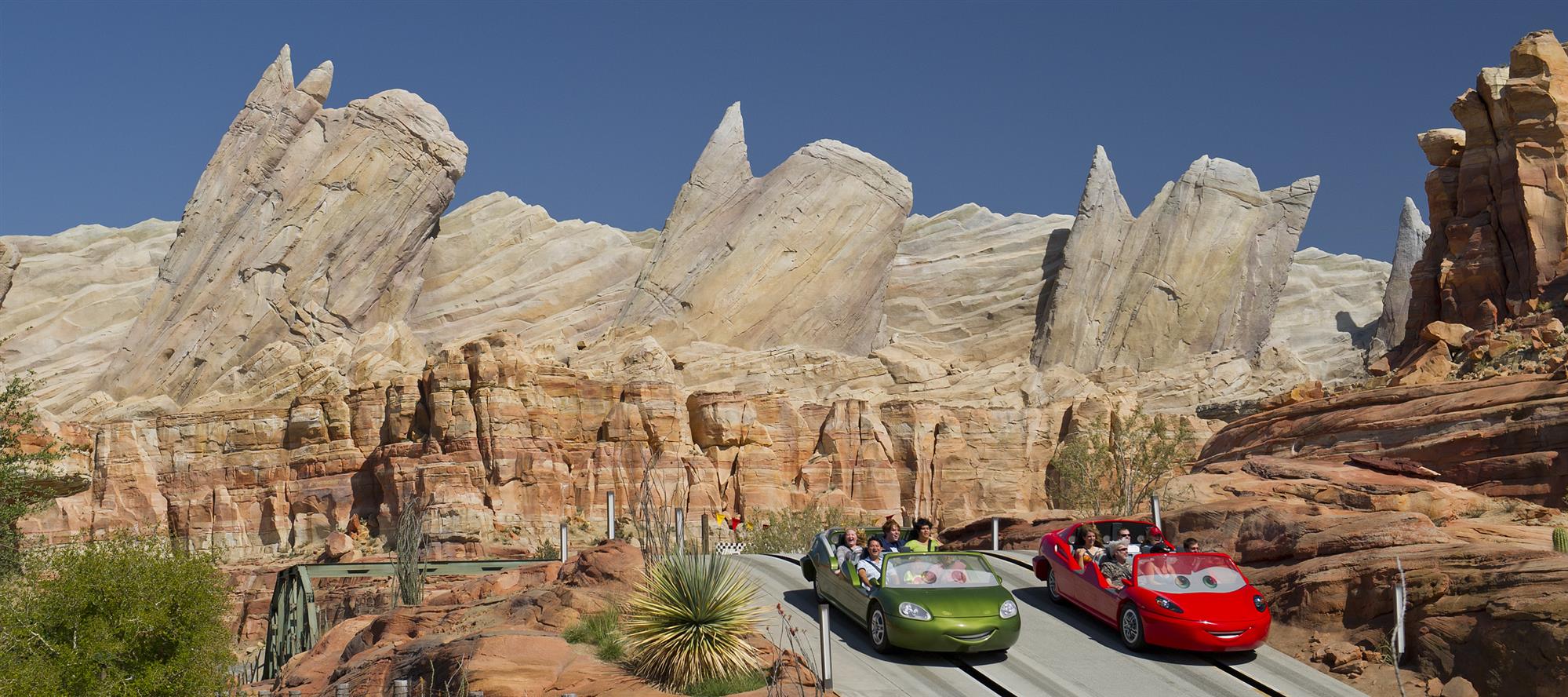 RADIATOR SPRINGS RACERS -- Cars Land features three immersive family attractions showcasing characters and settings from the Disney-Pixar film, "Cars," including one of the largest and most elaborate attractions ever created for a Disney park: Radiator Springs Racers is a twisting turning, high-speed adventure through Ornament Valley and the town of Radiator Springs. (Matt Stroshane/Disneyland Resort)