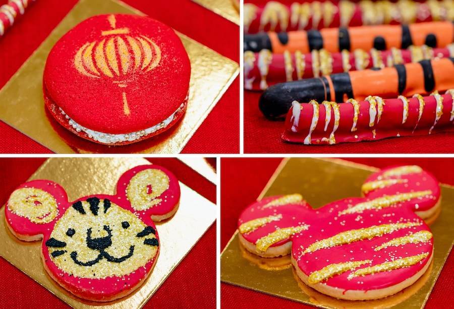 - Mickey-shaped Tiger Sugar Cookie: Sugar cookie dipped in red chocolate with gold Mickey-shaped tiger