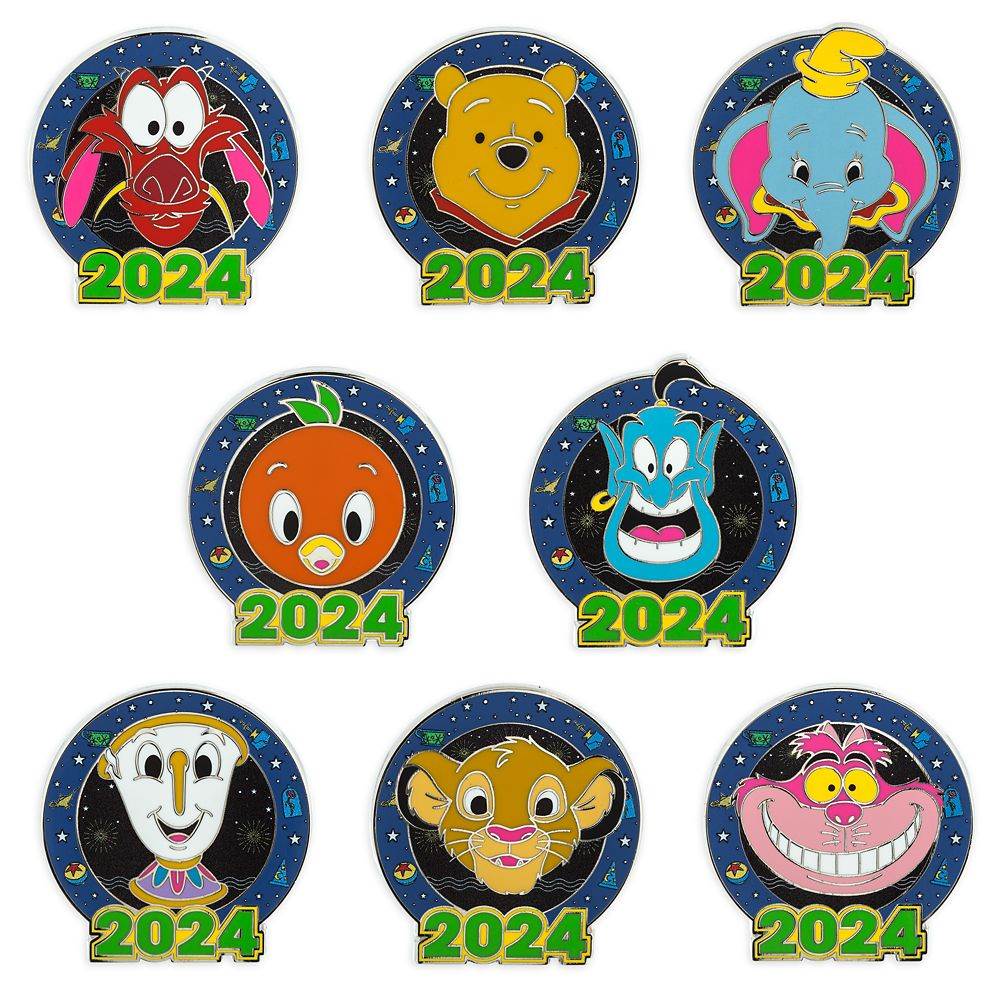 - Each box contains two randomly selected pins from eight overall designs including: Dumbo, Cheshire Cat, Winnie the Pooh, Orange Bird, Genie, Simba, Mushu and Chip, each with 2024 logo