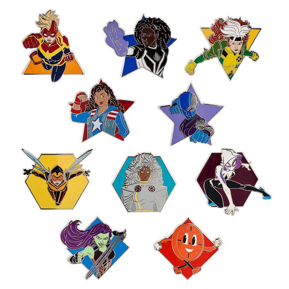 - Each box contains two randomly selected pins from 10 overall designs including: Captain Marvel, Storm, Jubilee, America Chavez, Miss Minutes, Ghost-Spider, Gamora, Nebula, The Wasp, and Photon