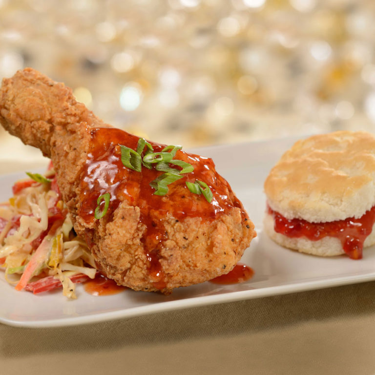 - Sweet and Spicy Fried Drumstick —Honey-chili glazed drumstick served with a pepper jelly biscuit