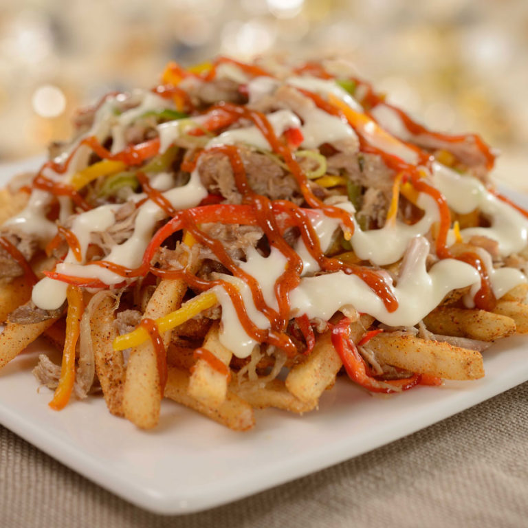 - Loaded Red Curry Duck Fries —seasoned fries topped with duck confit, red curry ketchup and white blended cheese sauce inspired by the Battle of Crait