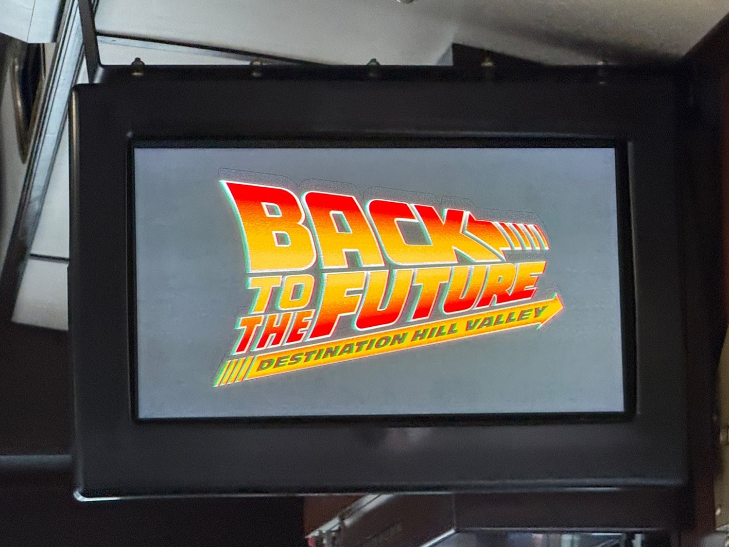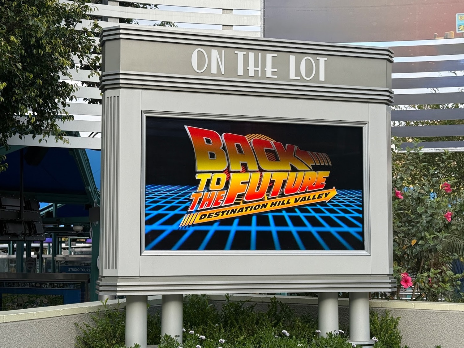 The Back to the Future: Destination Hill Valley experience begins at the entrance to the Studio Tour, as guests must board a tram to transport them to Courthouse Square on the Universal Studios backlot.