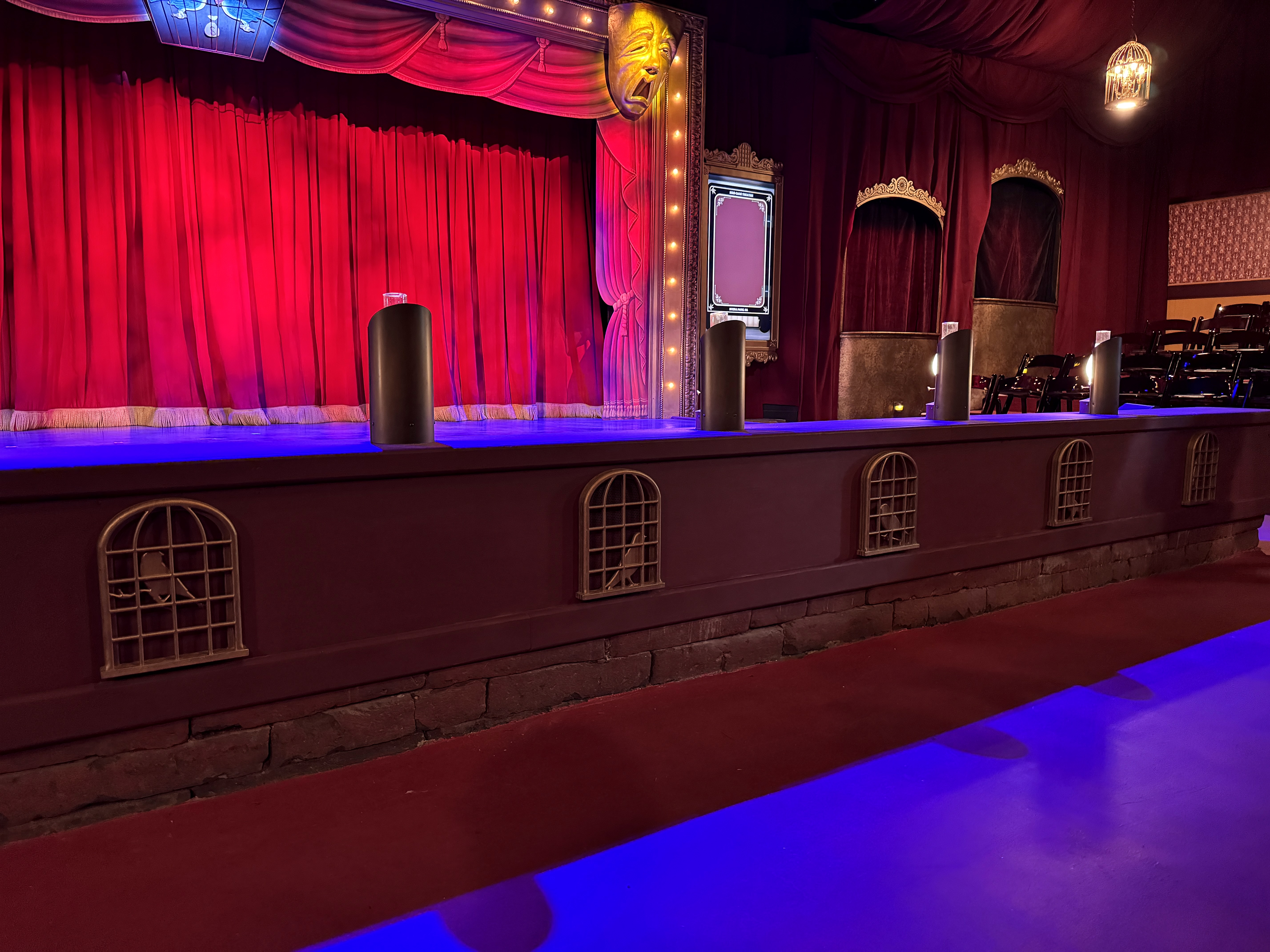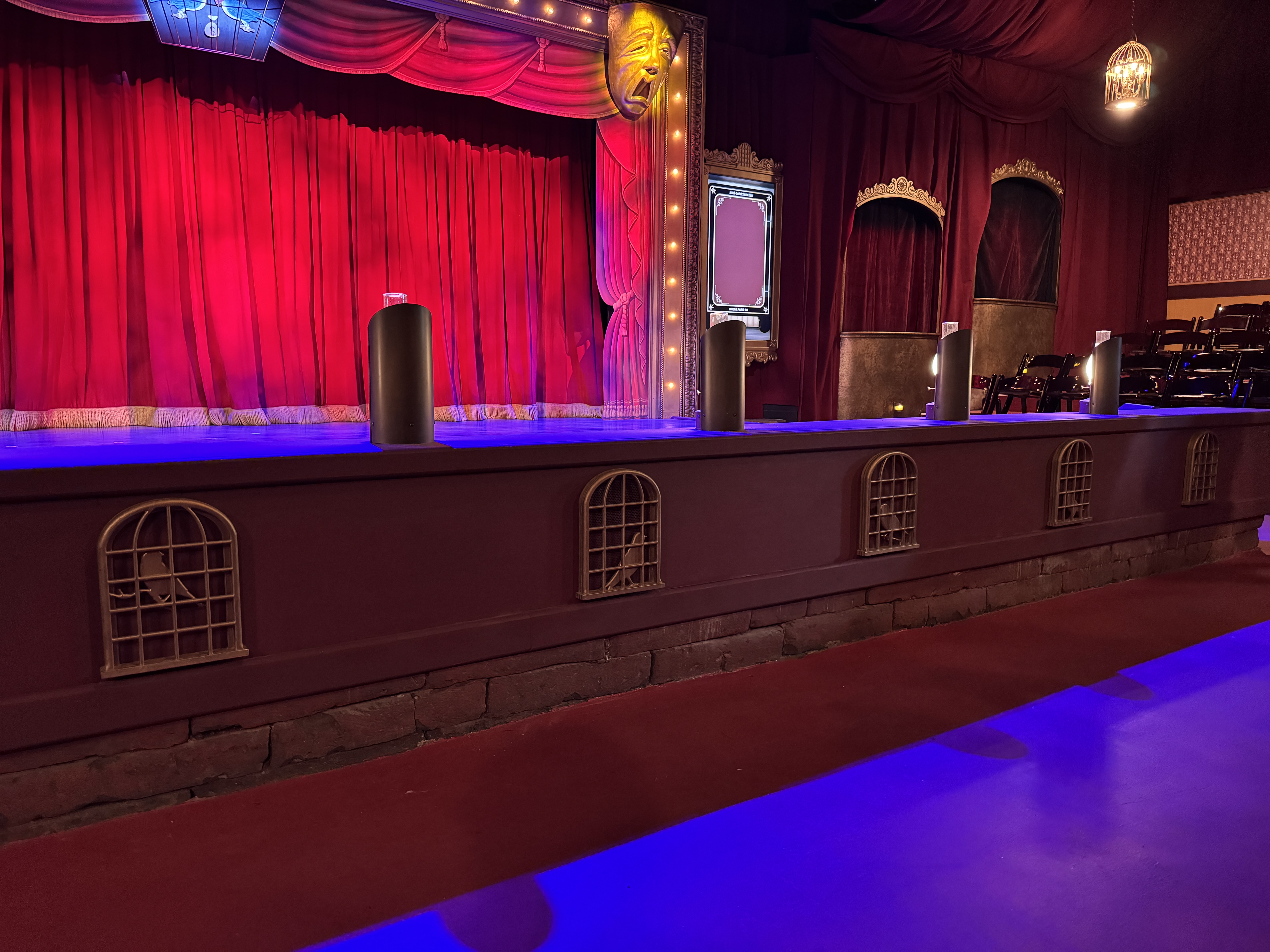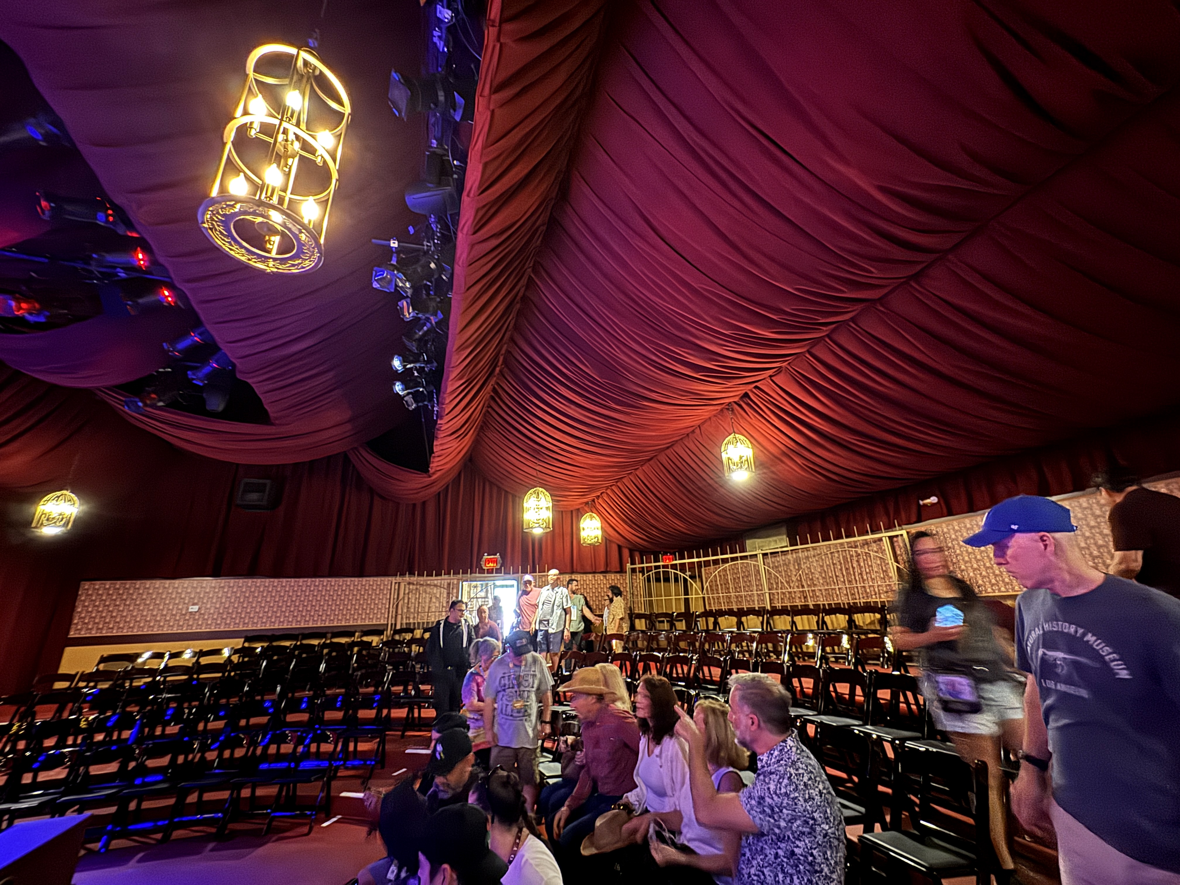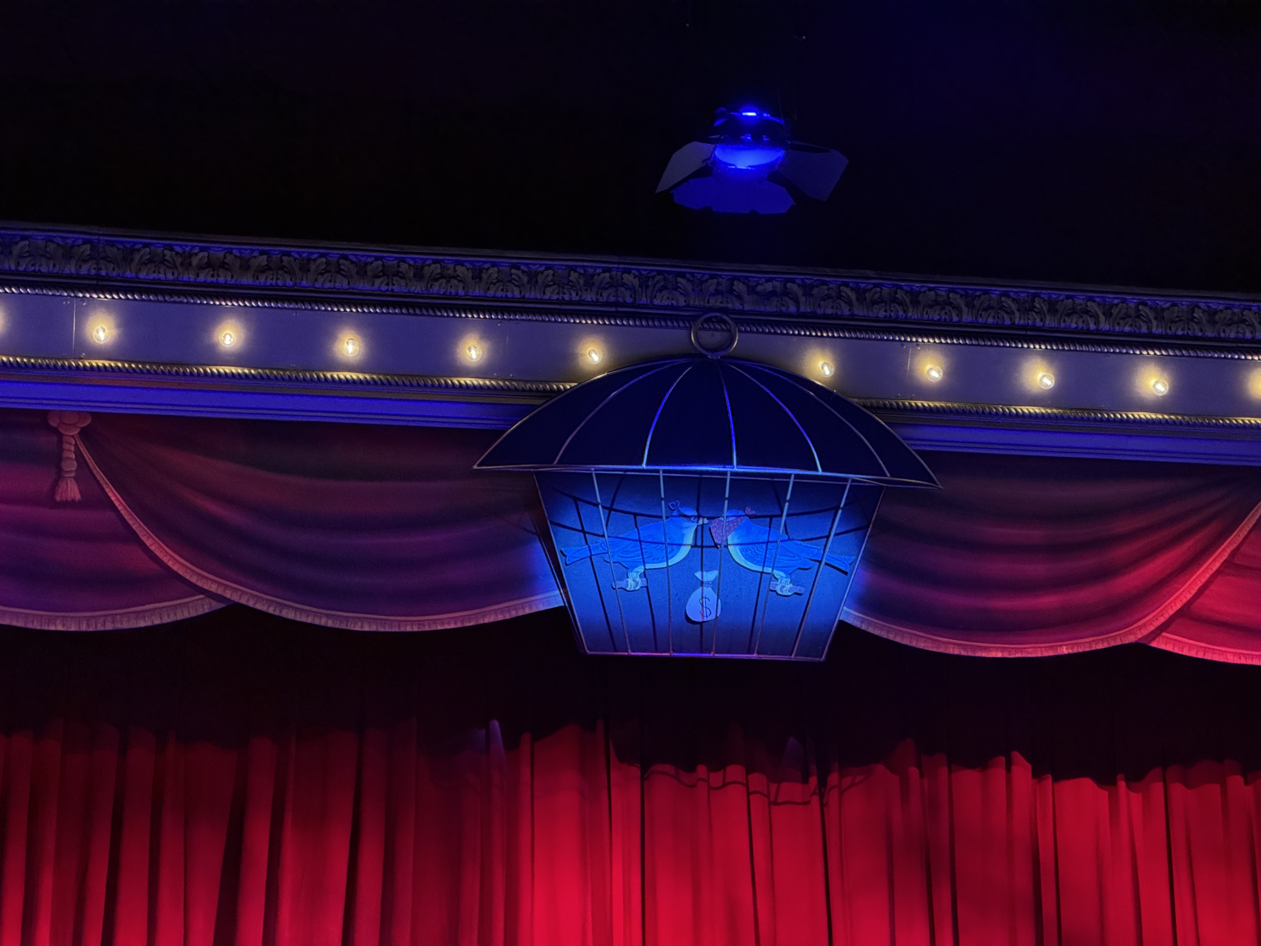 - Then it was time to move on into the theater's auditorium area, which is where the beautiful renovation really began to speak for itself. I found new wallpaper (modeled after the venue's original wallpaper), birdcage-themed light fixtures, a new red curtained ceiling, and more very impressive details all around.