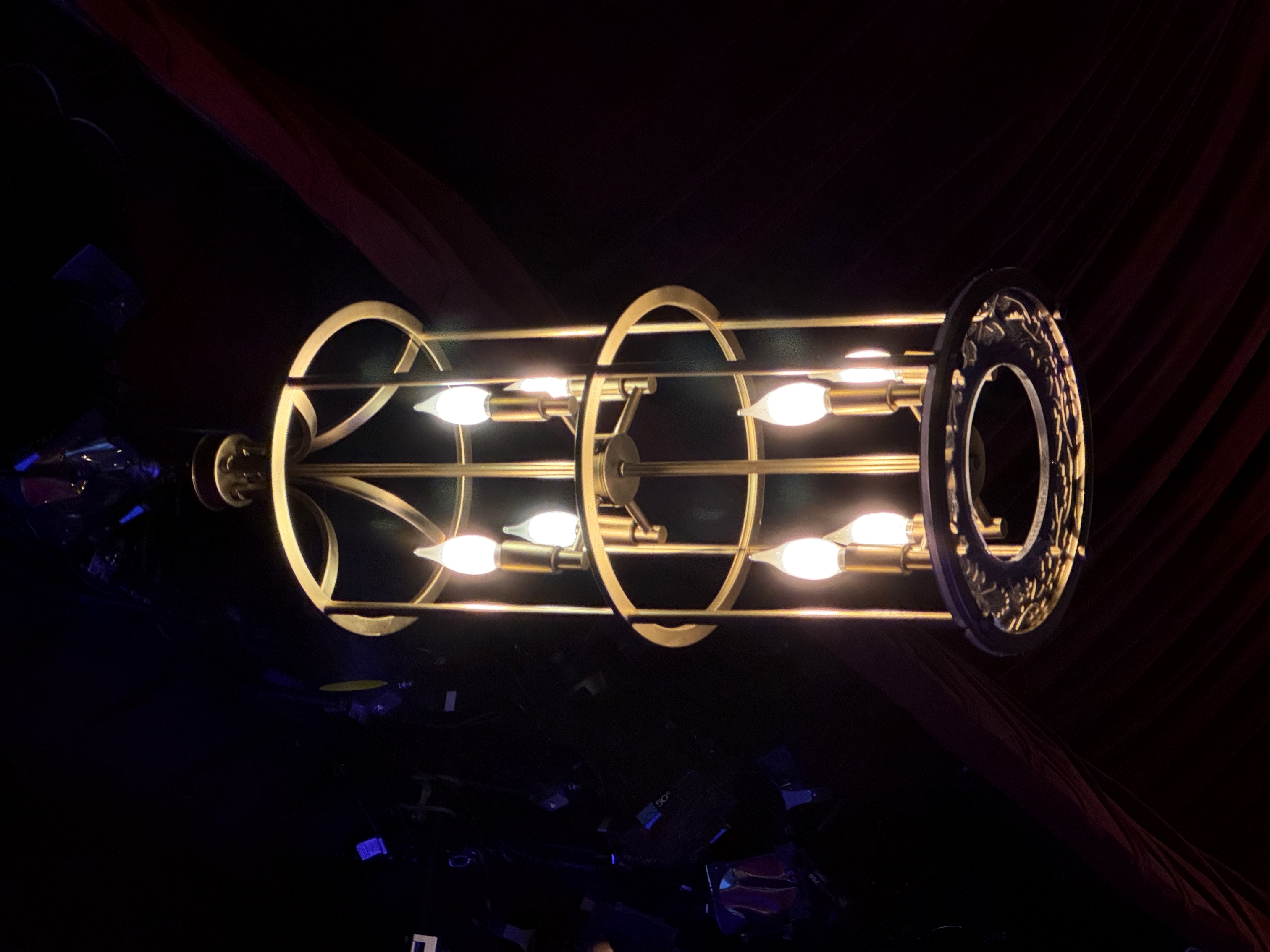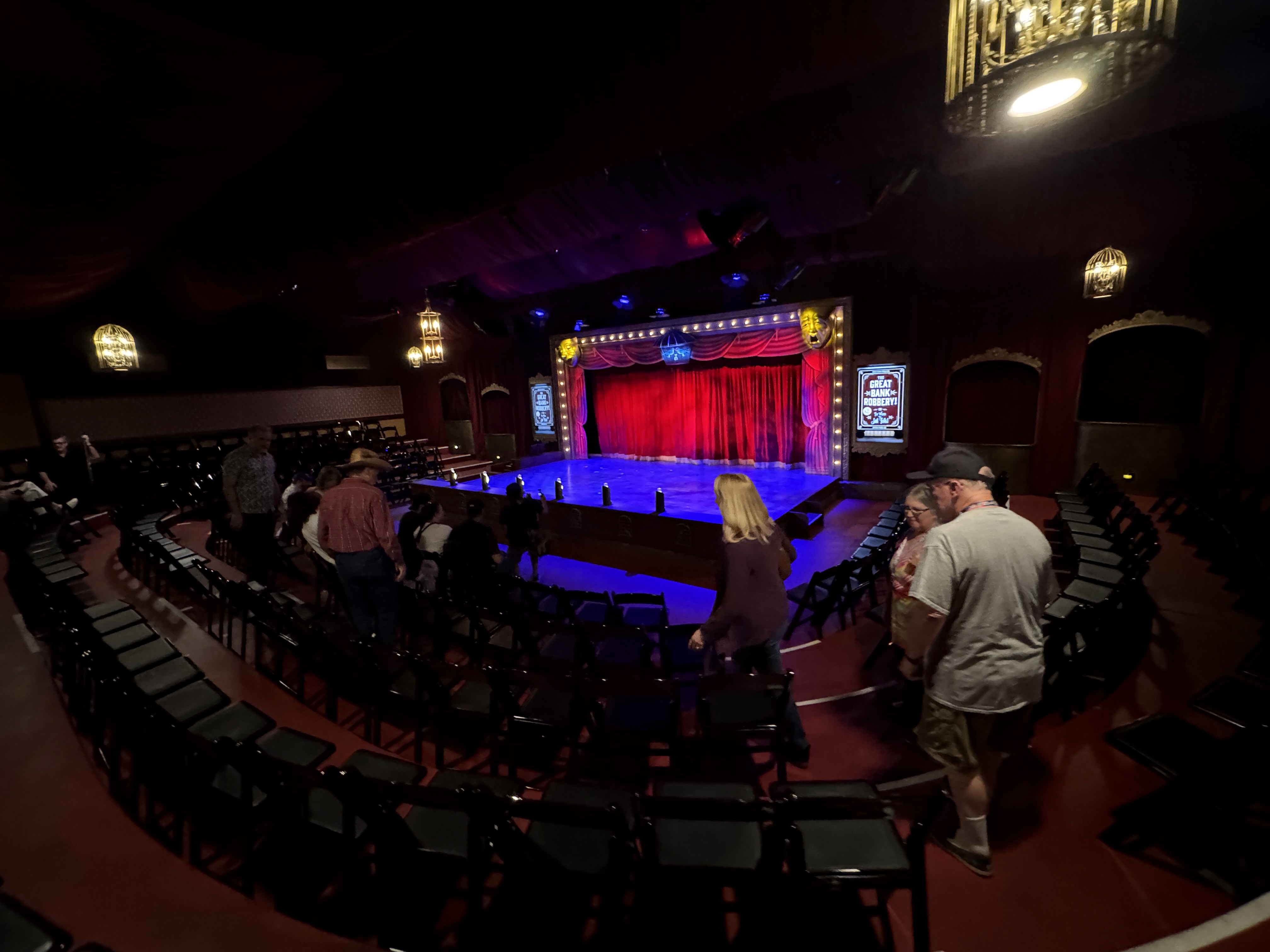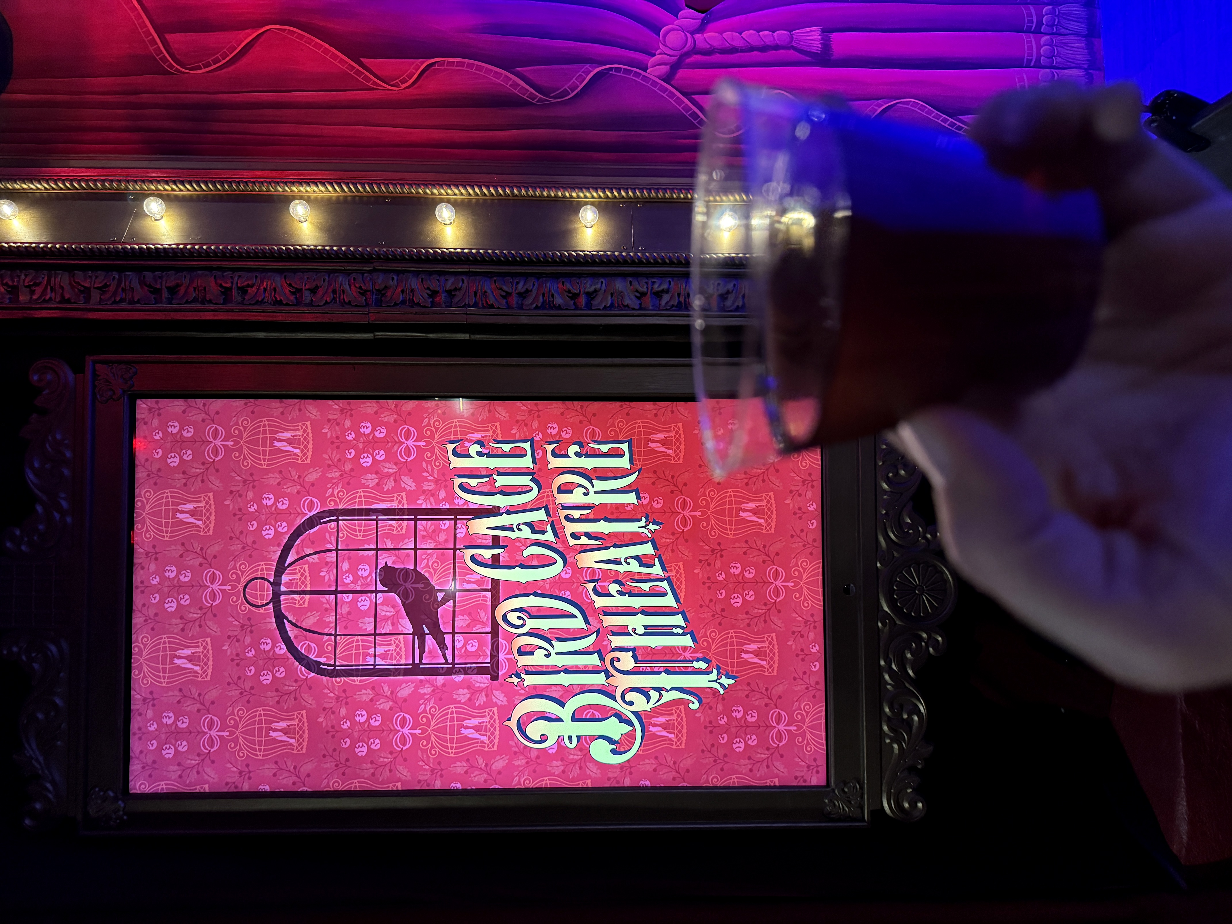 - Then it was time to move on into the theater's auditorium area, which is where the beautiful renovation really began to speak for itself. I found new wallpaper (modeled after the venue's original wallpaper), birdcage-themed light fixtures, a new red curtained ceiling, and more very impressive details all around.