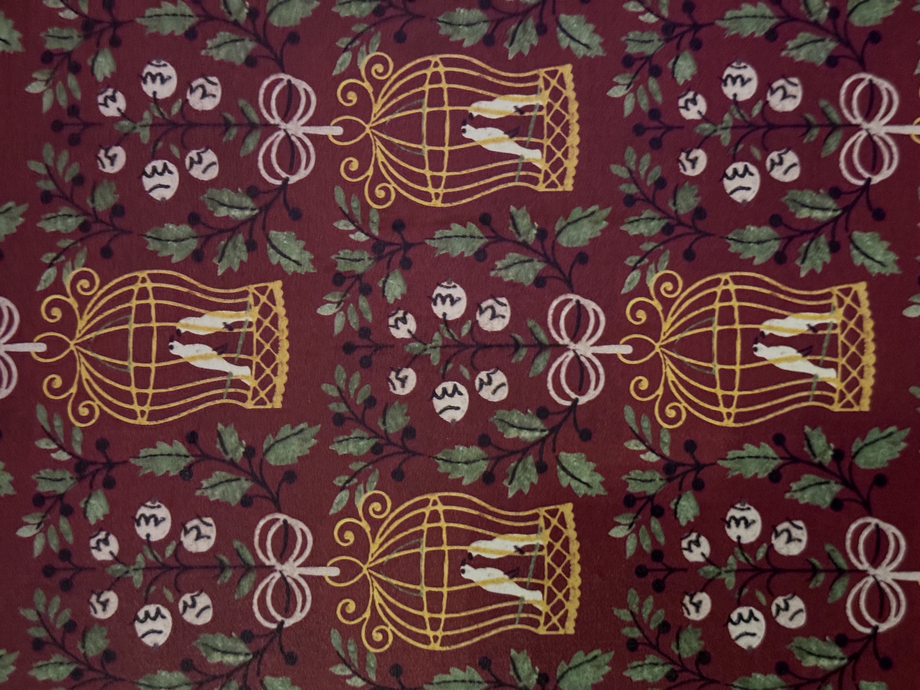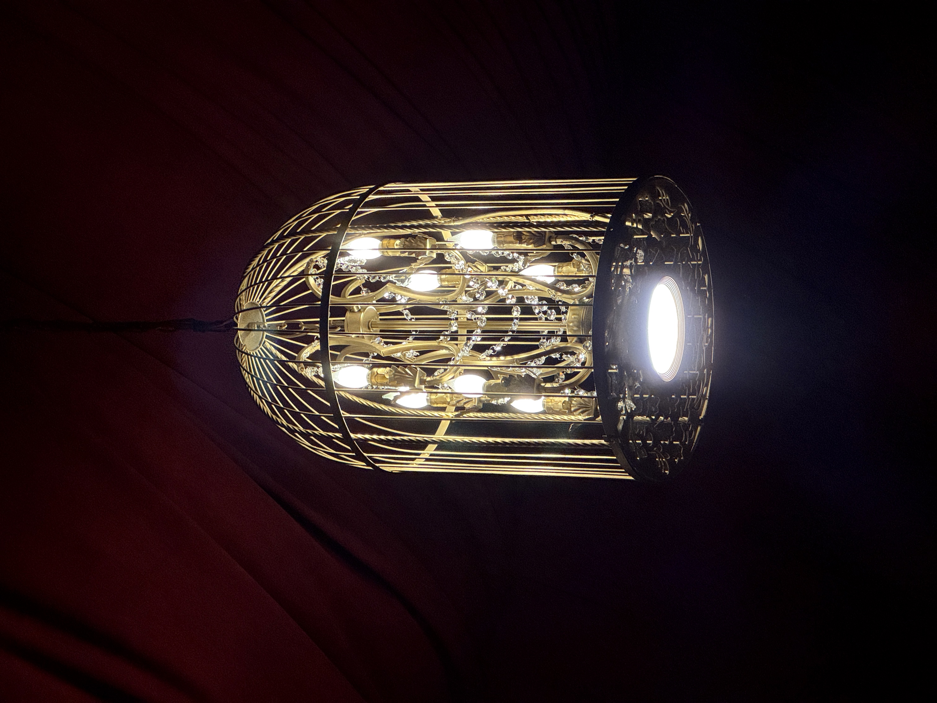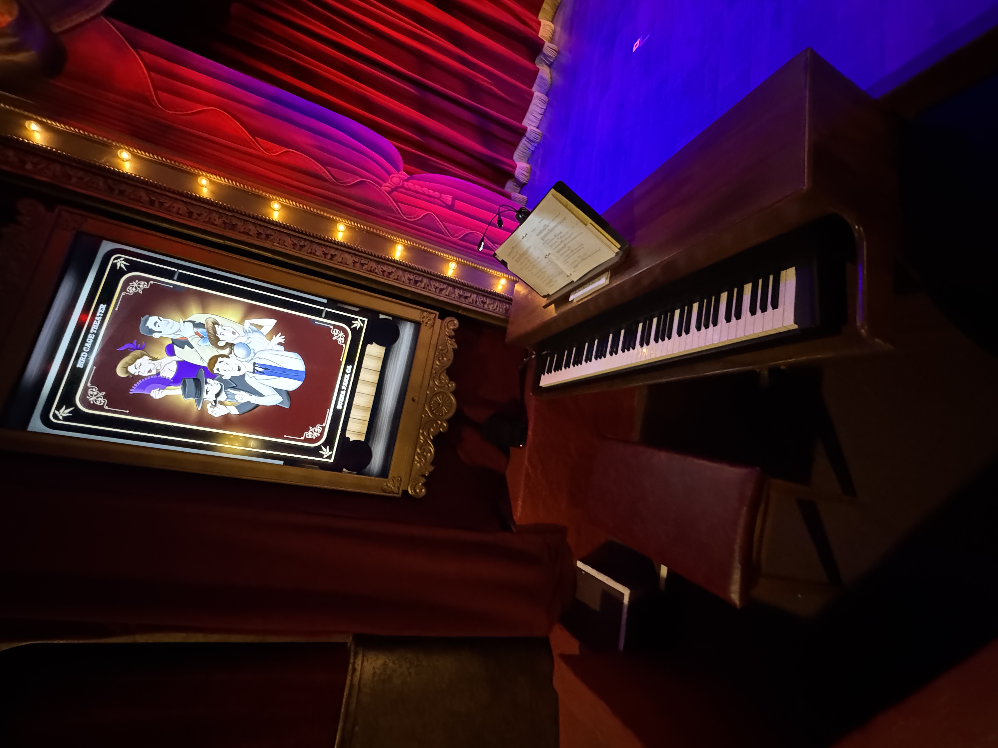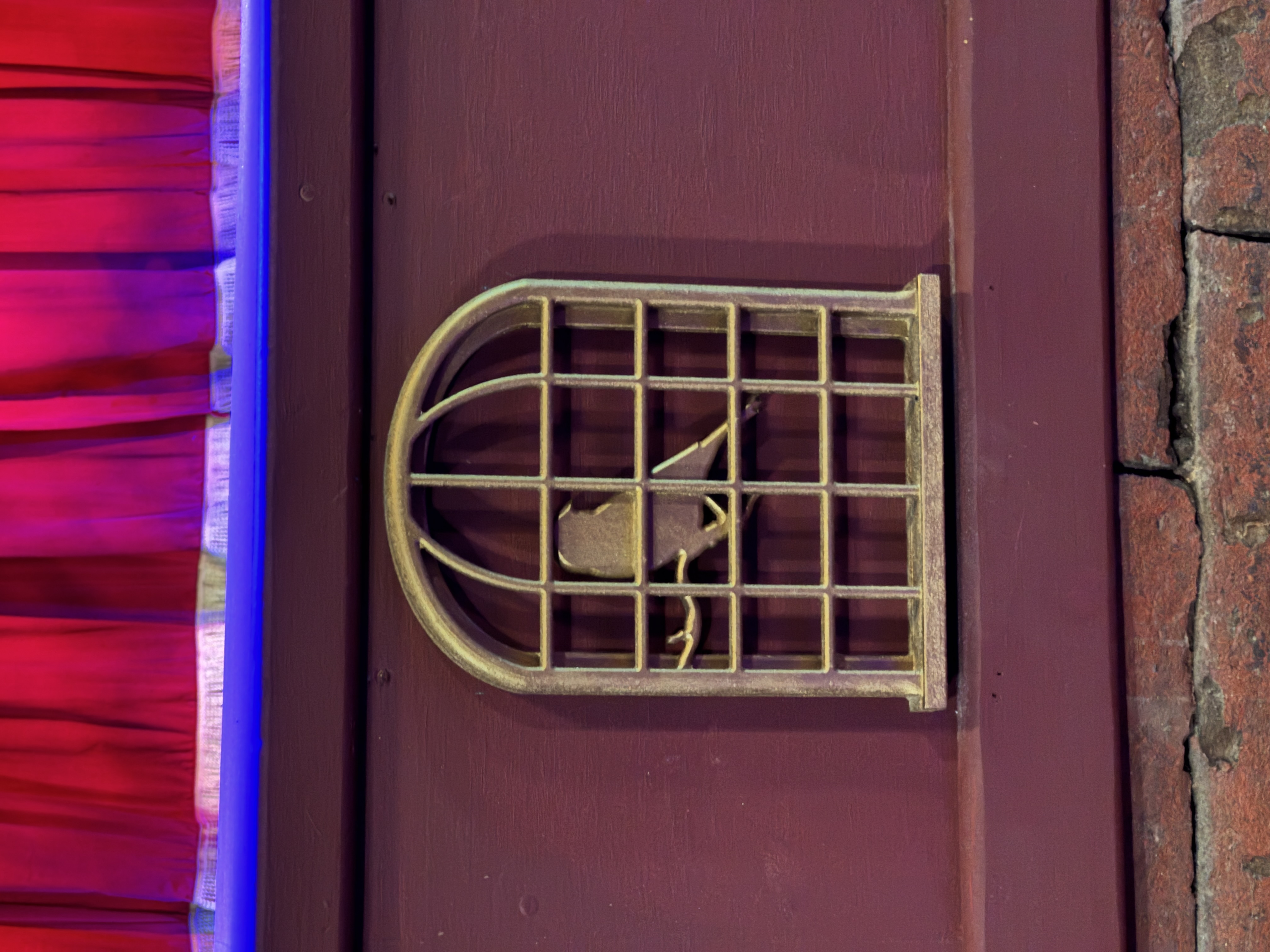 - Then it was time to move on into the theater's auditorium area, which is where the beautiful renovation really began to speak for itself. I found new wallpaper (modeled after the venue's original wallpaper), birdcage-themed light fixtures, a new red curtained ceiling, and more very impressive details all around.