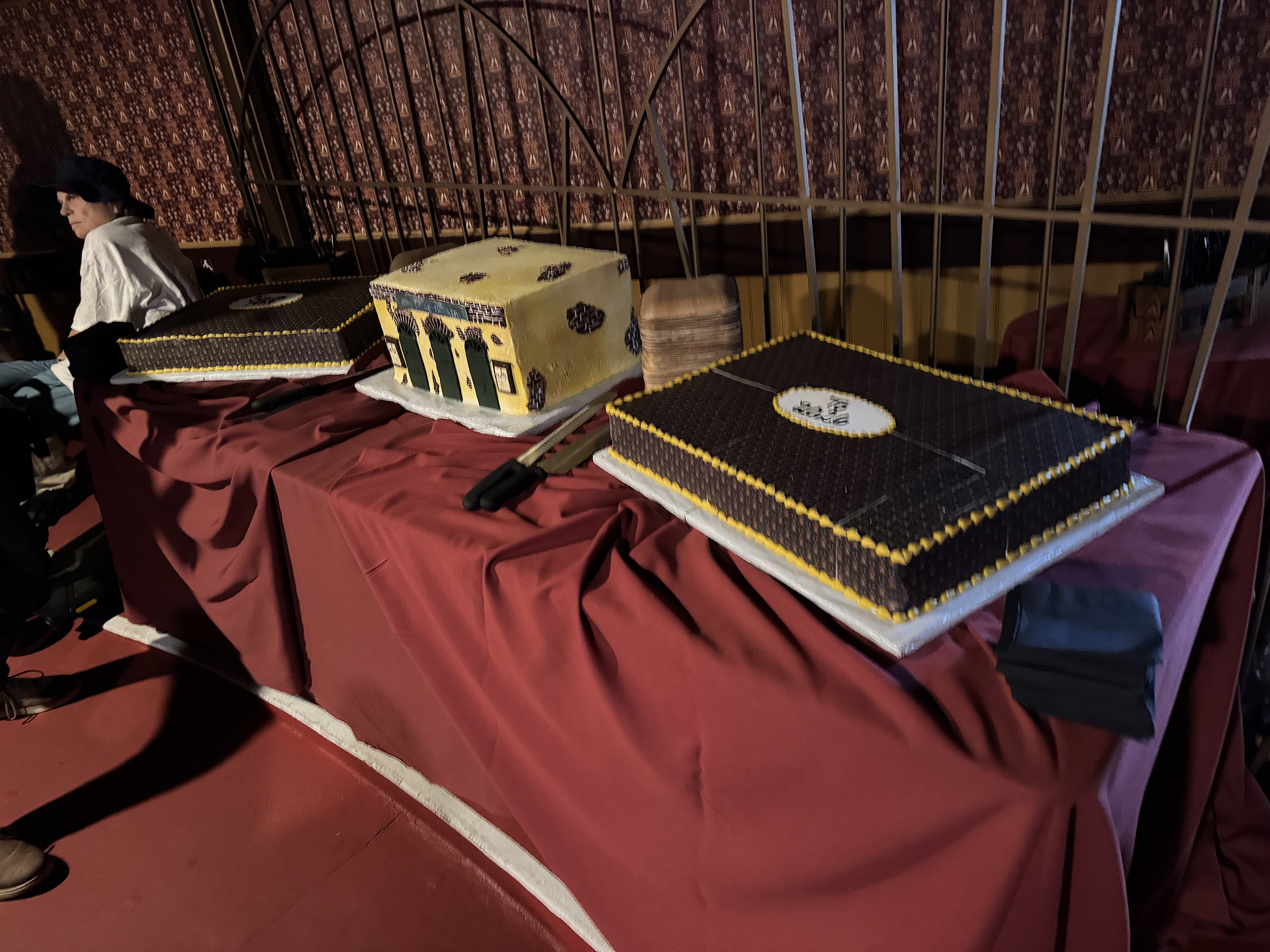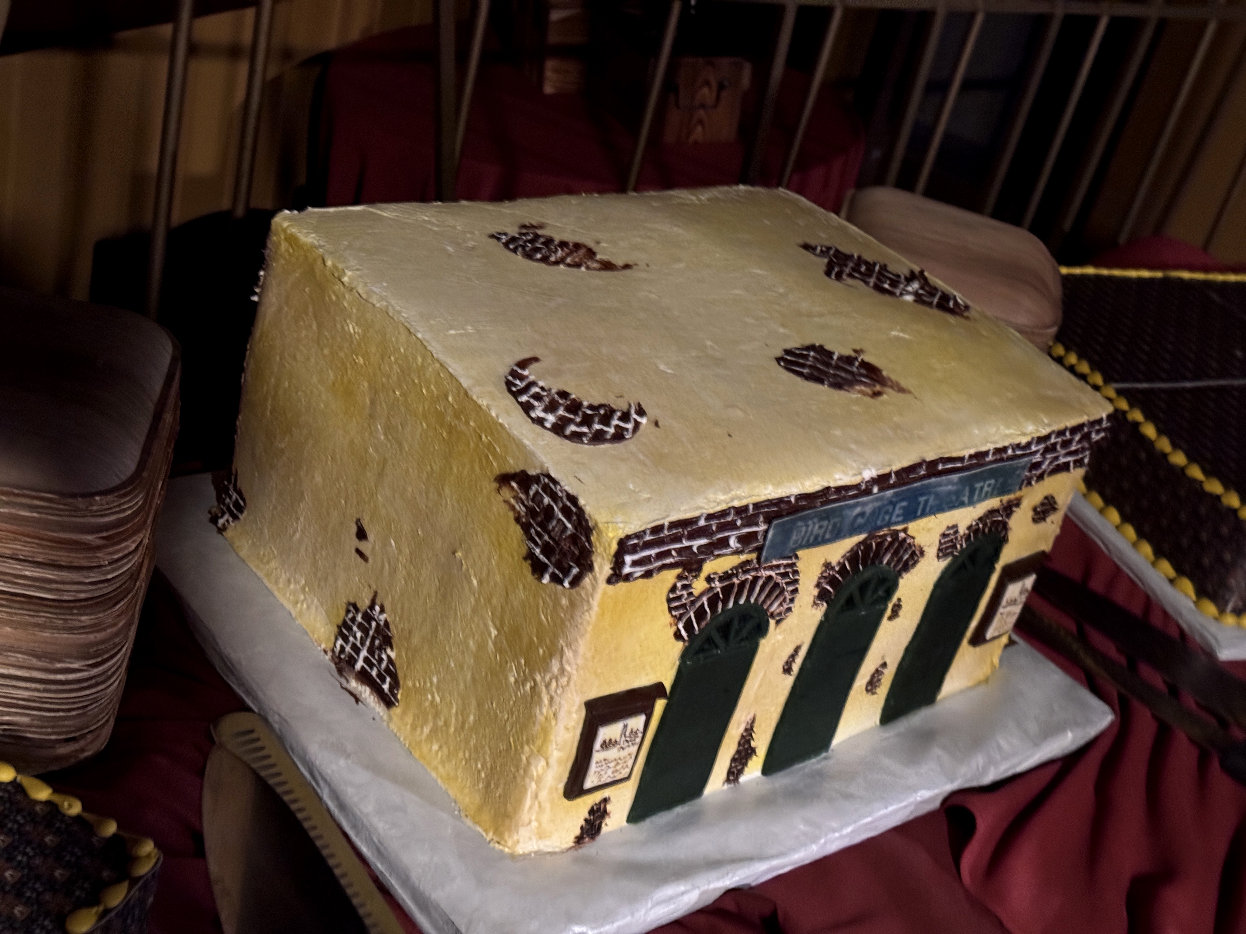 - As you saw in the panel discussion video above, the Bird Cage's reopening was celebrated with three cakes: two that featured the same pattern as the old/new wallpaper, and one that was shaped and decorated to resemble the location's instantly recognizable facade. Super neat! The event wrapped up with a toast-- using boysenberry champagne, naturally-- to seven more decades of the Bird Cage Theatre.