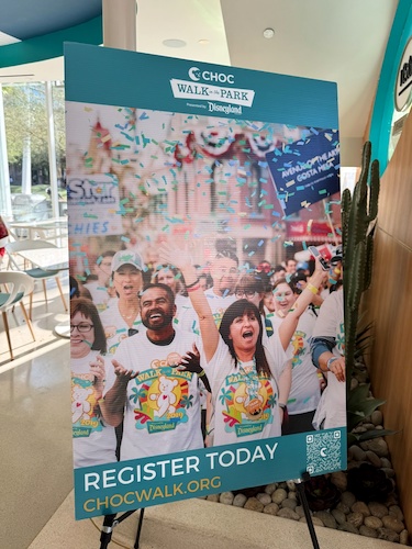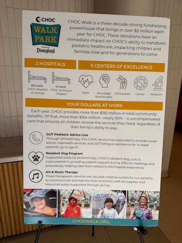 - During a gathering of social media supporters yesterday at Downtown Disney, CHOC’s Assistant Vice President of Community Engagement Zach Abrams, this year’s CHOC Walk Ambassador Belle Wuich, and Disneyland Resort Ambassador Raul Aquino Rojas gave a presentation during which they reminded us of some of the details surrounding CHOC Walk In the Park 2025.
