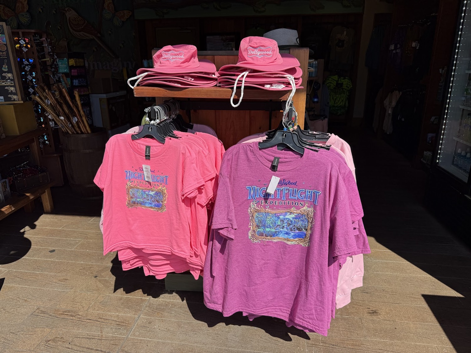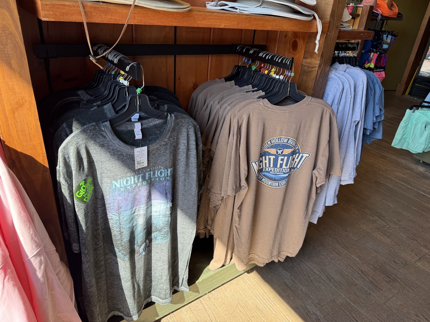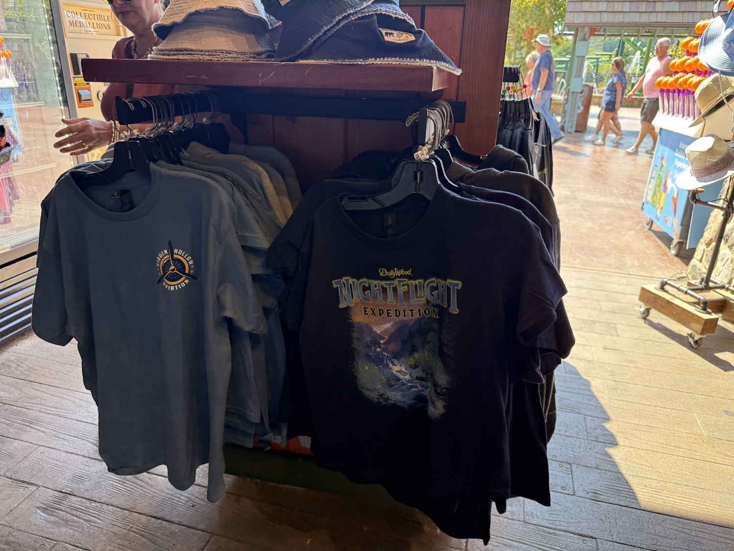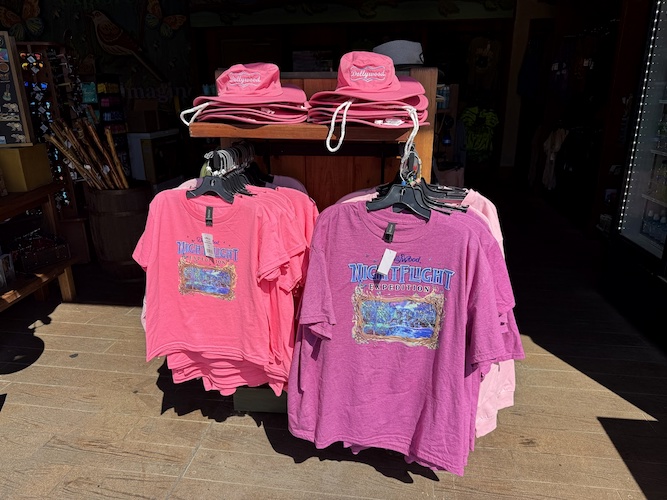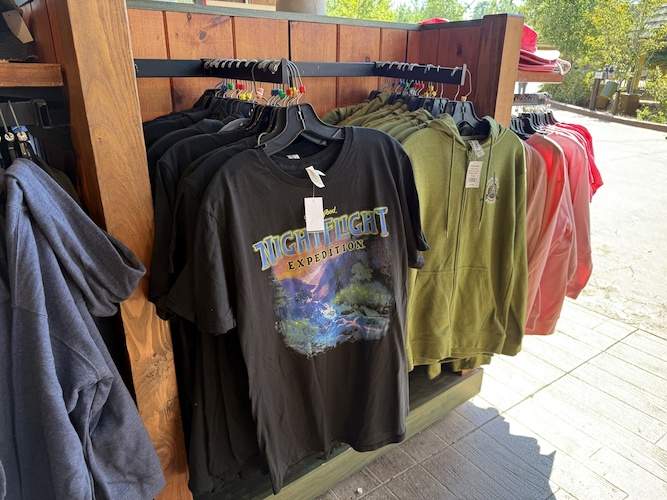Both the attraction art and title, as well as that of Hidden Hollow Aviation (without the ride name) can be found on different shirts and even zip-hoodies in various colors. While these pictures were taken at a retail location in the park’s Wildwood Grove area (future home of NightFlight Expedition), the items can also be picked up at the park’s Emporium on Showstreet.