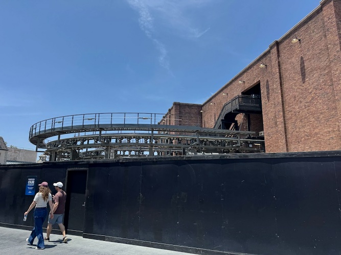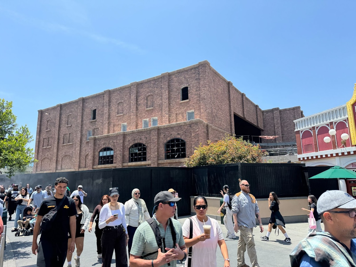 Since we last checked in on the project in March, scrims have come down around the main garage-themed showbuilding for the attraction, which is located across from the entrance to The Wizarding World of Harry Potter.