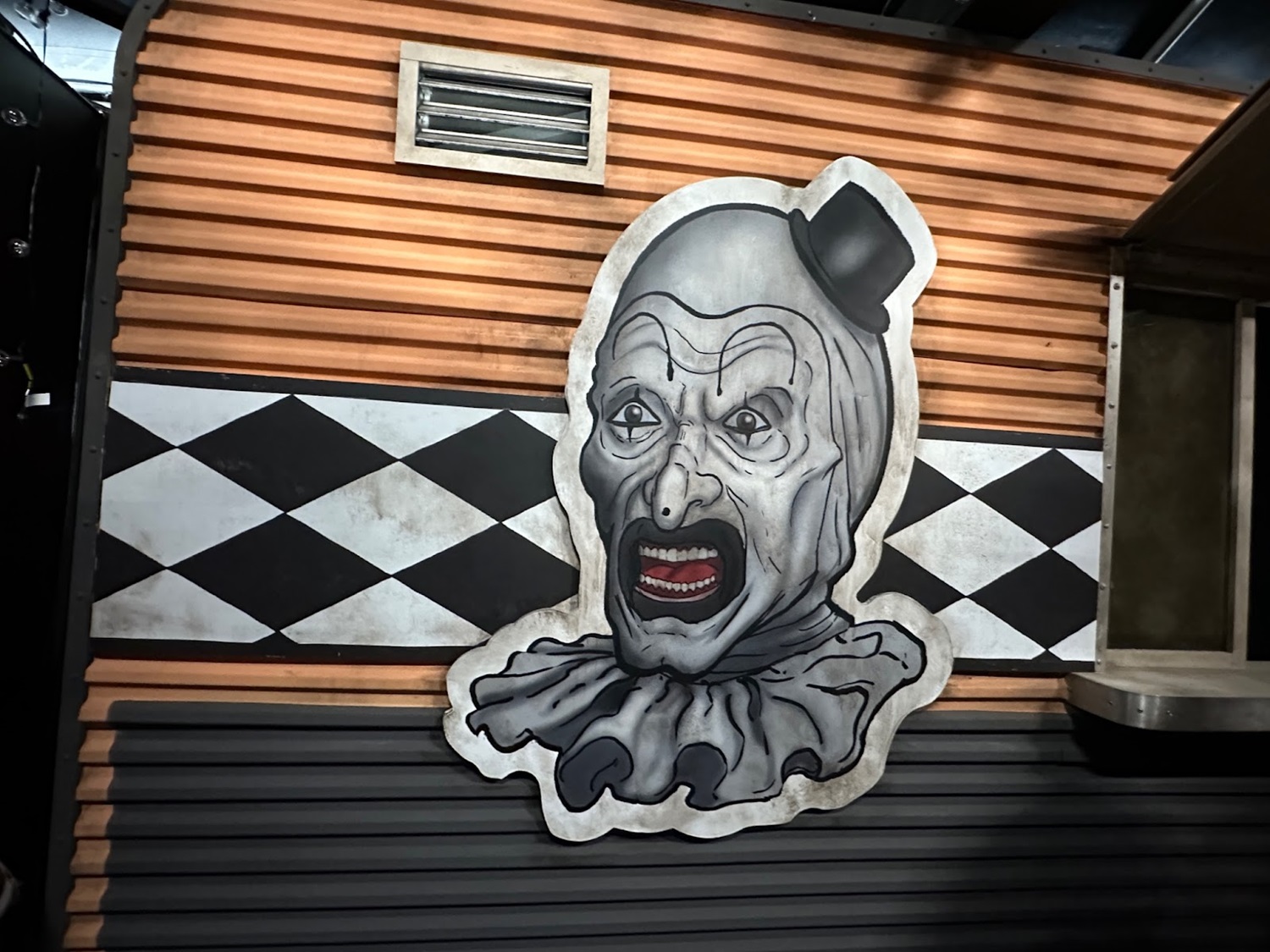 Terrifier’s now-iconic villain, Art the Clown, will not just be a scareactor in the Terrifier house, he will also be roaming about through Halloween Horror Nights, with Murdy noting these performers got special training to really bring the character to life. That will also include in the exterior queue for the Terrifier house, with Murdy describing a radio report that will play. “Somebody has spotted a tall, thin man in a black and white clown costume, carrying a black plastic bag. And as the reporter is saying that, you're going to see Art materialize where the devil’s head (on the house facade) is and then he's going to open the gate and he's going to come out and he's going to start messing with you. We’ve put all of these performers through our own version of mime school, basically, but there's one Art dedicated just to the facade. There's a gate so that he can interact with the people entering the house. But he can also go out into the queue line."