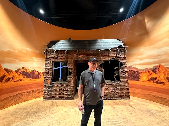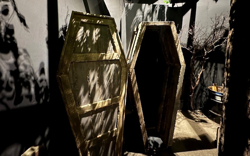 After that are portions that cover the non-Lucy parts of the storyline, including The Ghoul’s grave being dug up, and the scene where Maximus and the heavily armored Knight he squires for, Titus, are confronted by a mutated Yao guai bear inside a cave. This was the one room we couldn’t take photos in yet, but Murdy told us, of the bear, “This thing is massive. When we were sculpting it, just the clay alone weighed 500 pounds. It's one of the biggest creatures we've ever built for Horror Nights." In addition, “Titus is an animatronic. That's what they're building right now. And he says, ‘Go inside that cave and see if the target’s in there…’ And then all of the sudden, the bear attacks, which is a big, huge puppet in effect. And then Maximus tries to shoot it and we're kind of in the middle of all of that action."