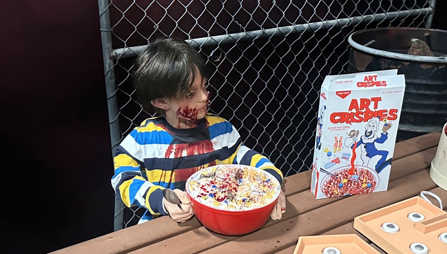 As Murdy explained, “I told our casting people, ‘Make this the worst casting decision you've ever made. Just make it way too short and make his physical build totally different from Art.’ And he's sitting there and he's just scrolling on his phone, listening to his music, but behind him is the real Art. But this dude just thinks it’s his fellow cast member trying to mess with him. So as you come in, he's going to be lip syncing to a track, and he's going to be like, ‘Dude, how many times have to tell you, don't try to scare me when I'm on my break!’ And then he notices there's all these people walking backstage, and he's like, ‘Hey, you guys aren’t supposed to be here…’ But before he can say anything else, Art slashes his throat… and you get showered in blood!’"