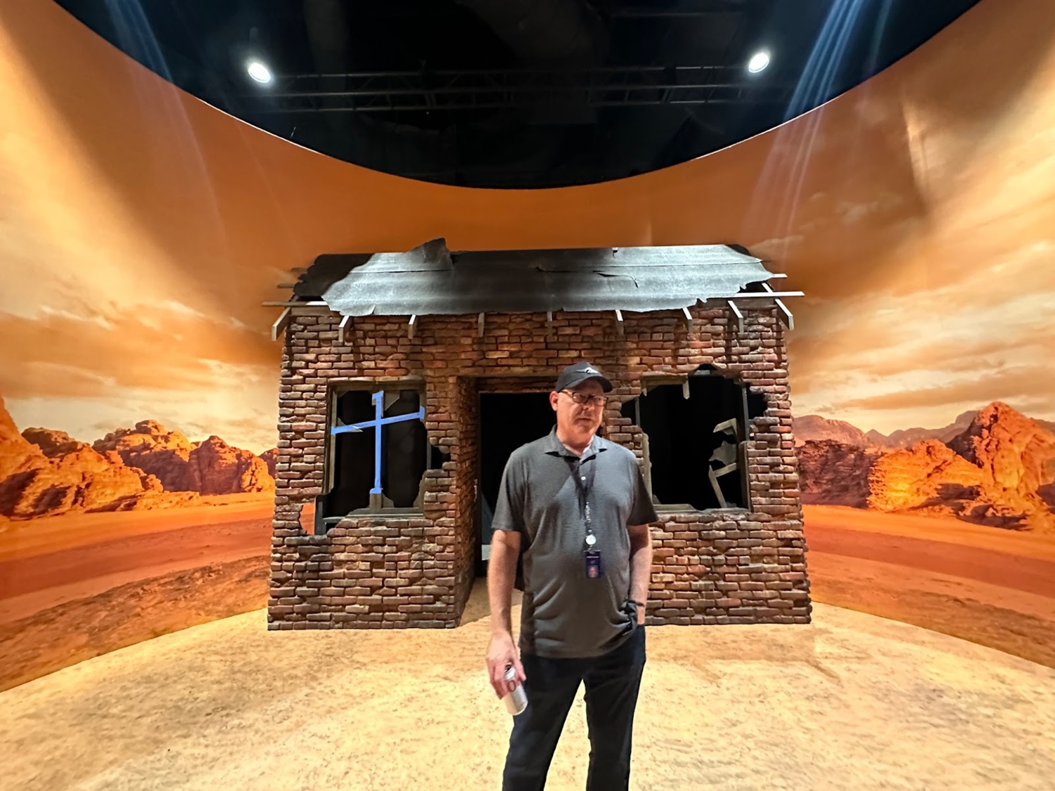 Murdy then brought us into the next setpiece, as Lucy leaves the vaults for the outside world of the post-apocalyptic wasteland. Murdy told us this visual was being accomplished “With a huge Cyclorama; big, huge, dimensional set pieces; a printed floor graphic; and then the final layer is actual sand and dirt, and that gets piled up in the corners." On top of that will be “All of the bodies that have been completely obliterated by the nuclear bombs. As you're coming in here, you're hearing Geiger counter clicks to tell you it's highly radioactive, but you're also hearing weird sounds coming from the window. It's a ghoul that is in the process of going feral, trying desperately to hang on to his humanity. In that [other] window, you see radroaches. Everything, all the animals and insects, have also been altered by radiation."