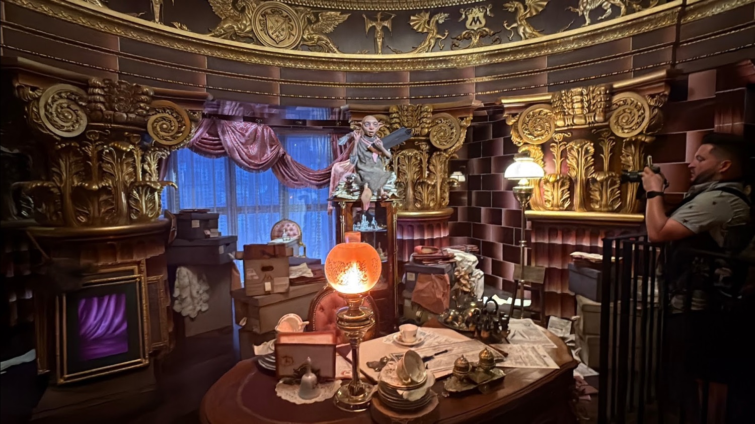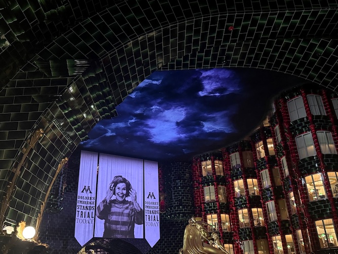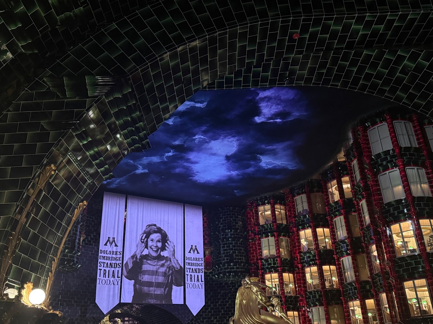 A glittering chandelier illuminates Dolores Umbridge’s former office, which is revealed to be just as over-the-top as the woman herself with its pink hues and ornate gold carvings throughout. Here, guests will meet Higgledy, Umbridge’s former house-elf, for the first time as she enthusiastically cleans out the office ahead of the trial.