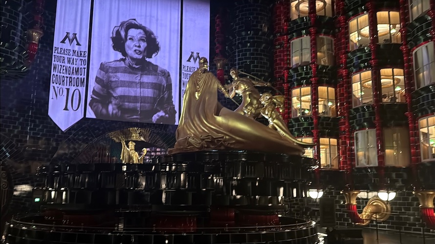 Upon reaching the attraction itself, guests will board a magical, omnidirectional lift that seats up to 14 guests to travel even deeper through the British Ministry for the long-awaited trial of Dolores Umbridge. Adorned with vibrant red and gold accents, these lifts are unlike any ride vehicle ever created and will propel guests up, down, forward, backward, sideways and more throughout the Ministry – just like guests have seen in the films.