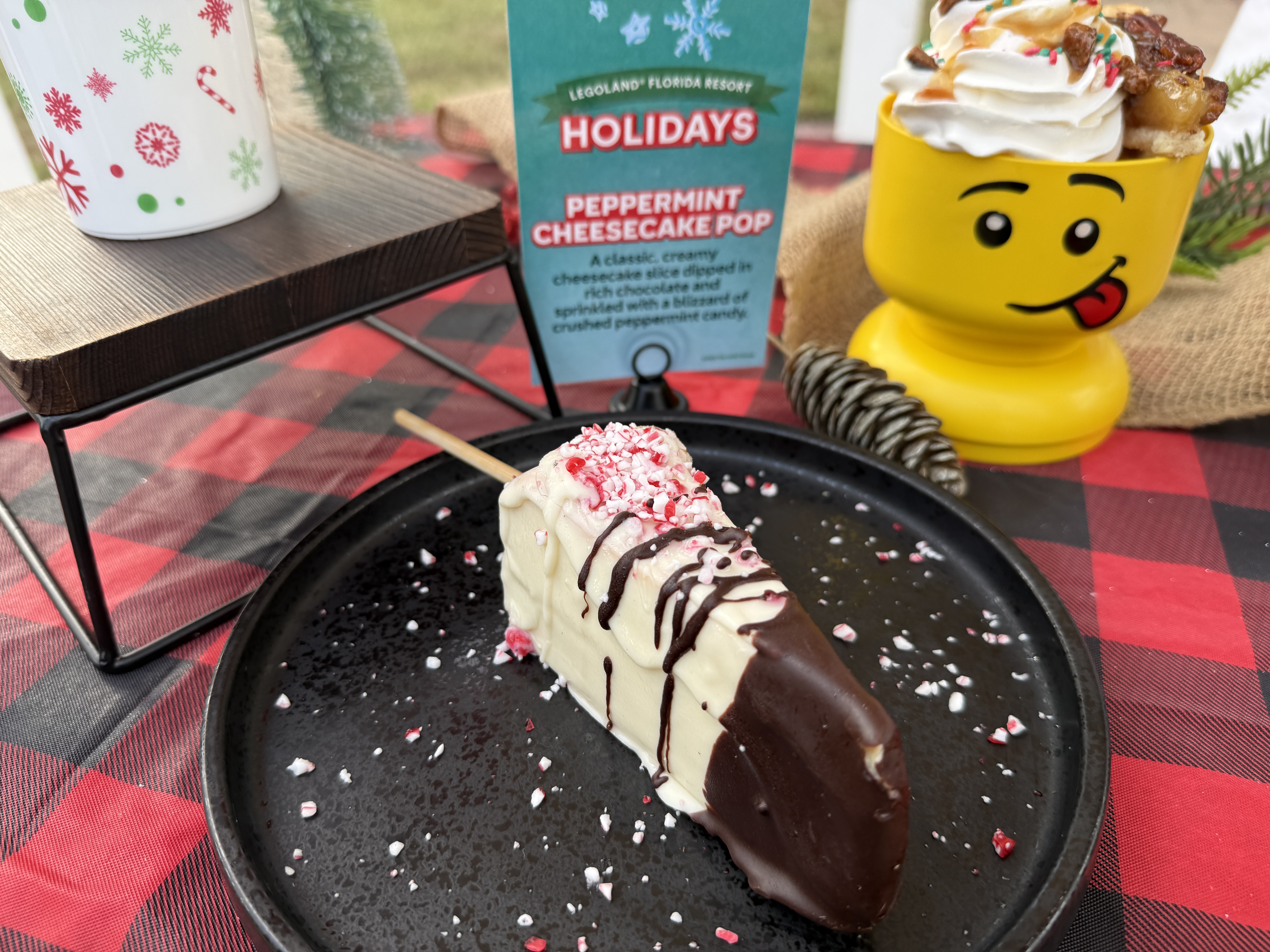 - Peppermint Cheesecake Pop (LEGOLAND Coffee Co.) – A classic, creamy cheesecake slice dipped in rich chocolate and sprinkled with a blizzard of crushed peppermint candy.